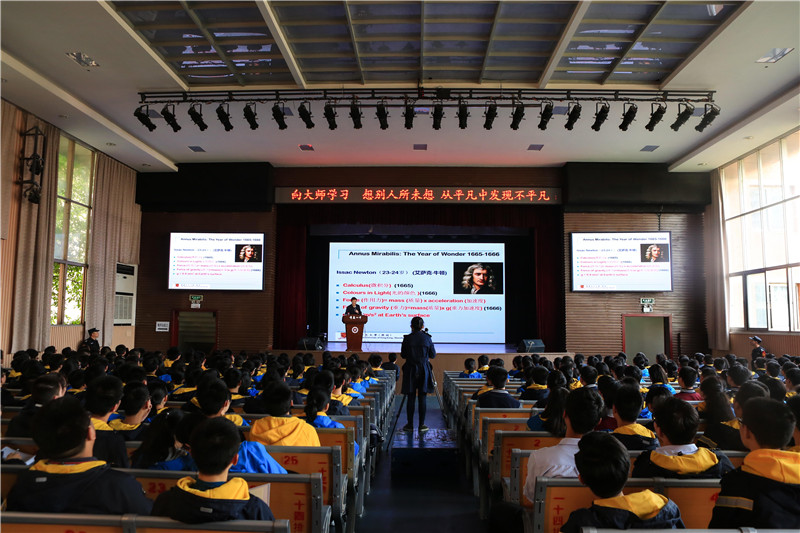 紧接着,唐院士又带大家走进了艾萨克·牛顿和阿尔伯特·爱因斯坦等大师的物理世界。一个个新奇问题让同学们的思维飞速运转,在物理的世界里尽情遨游。在与学生的互动中,他鼓励学生大胆质疑,“举起手,张开嘴”,对学生的回答予以肯定,并耐心修正不足之处。复杂枯燥的物理知识在唐院士的口中变得浅显易懂而生动形象,尤其是对爱因斯坦的一些物理公式的推导分析更是把全场气氛推向高潮。