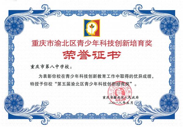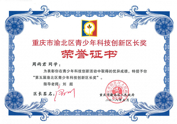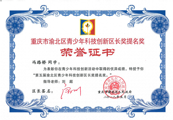 经区青少年科技创新区长奖评审委员会评议,我校周雨君同学获第五届渝北区青少年科技创新区长奖,冯路桥同学获区长奖提名奖,同时,我校荣获渝北区青少年科技创新培育奖。
