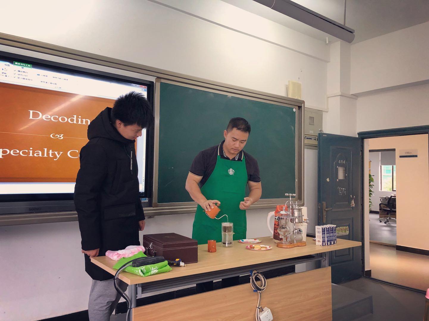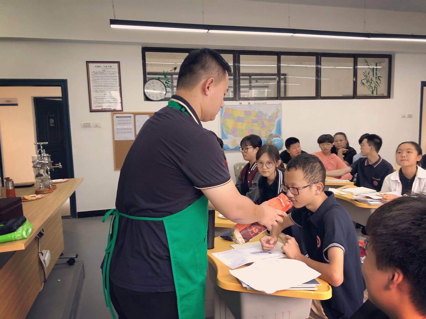 国际部兼职教师宏帆中学网红大厨史天昊再次穿上曾经在美实习期间的小围裙,为同学们带来精彩的咖啡专题讲座。国际部的田羽加同学还亲手做了饼干,现场同学们吃着饼干就着现磨咖啡,一起度过了欢声笑语的下午。