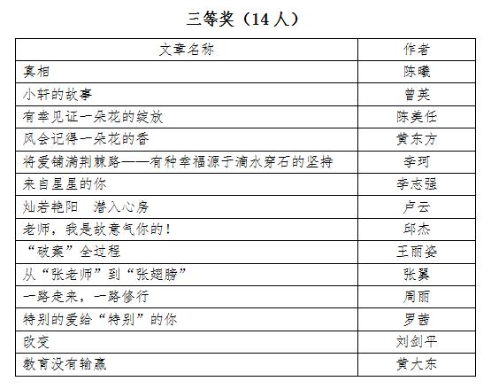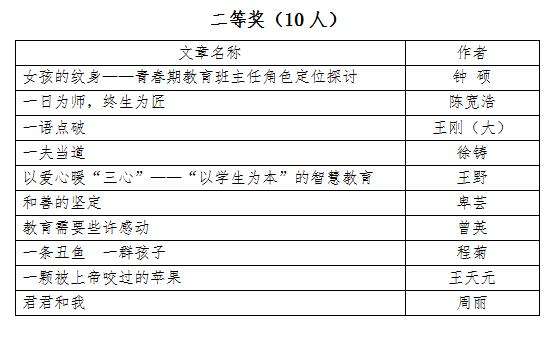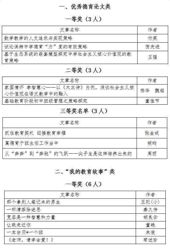 2018年12月10日,重庆市教育学会德育专业委员会举办的第九届学术论文评选活动结果揭晓。我校德育工作者取得优秀成绩,付英老师等9人分获“优秀德育论文”一二三等奖,王刚(小)老师等30人次分获“我的教育故事”一二三等奖。