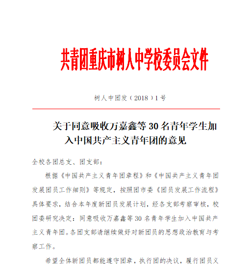 关于同意吸收万嘉鑫等30名青年学生加入中国共产主义青年团的意见