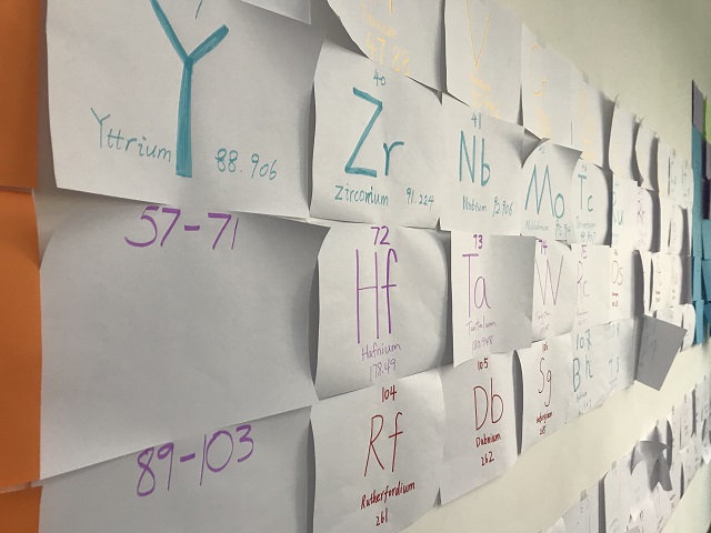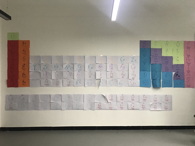 学生们制作的英文版元素周期表,不仅用色彩装饰了教室,更用教室充满了知识与文化的气息。