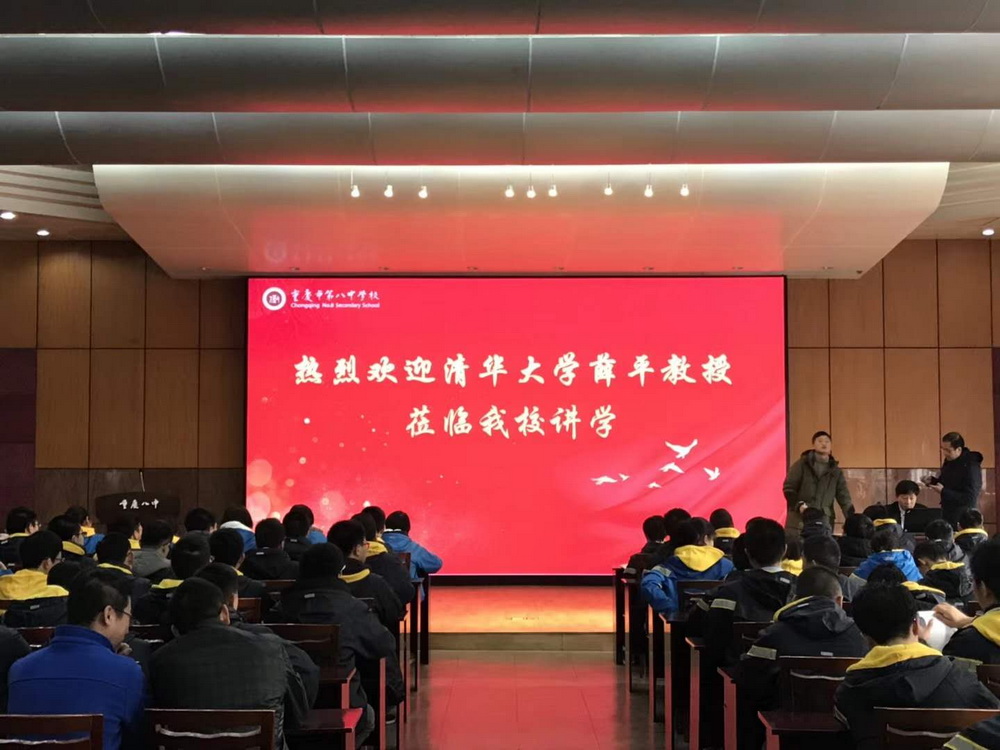12月17日下午,沙坪坝校区逸夫楼六楼报告厅热闹非凡。高一高二的部分优秀学子,以及年级部分老师和家长齐聚一堂,共同聆听清华大学薛平教授关于物理及清华物理系的讲座。薛平教授是清华大学物理系教授,博士生导师,现任中国物理学会科普委员会、清华大学国际纳米光电子学研究中心副主任,国家高技术项目首席科学家,基金委科学仪器重大专项负责人。我校付英副校长、梅家烨主任出席本次活动。