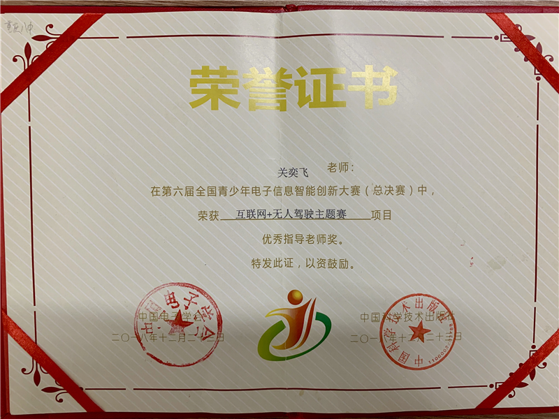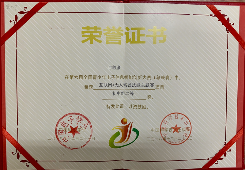 宏帆中学初2020级23班唐晨栋、38班阮海凌、42班冉峻豪三位同学在关奕飞老师的带领下,经过全国约一万左右选手的网上初复赛激烈角逐,以全市前3名的成绩代表重庆首次参加“无人驾驶项目”全国现场总决赛(重庆唯一入围全国赛的中学校),3位同学经过现场命题搭建编程,从160多支队伍中脱颖而出,最终荣获3个二等奖,同时关奕飞老师被评为优秀指导老师。