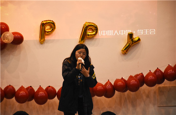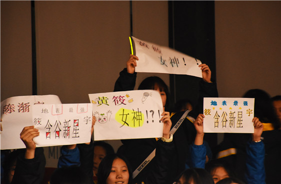 在决赛现场,我们有幸邀请到了专业老师来担任本次大赛的评委,他们是苏禾老师、徐玉龙老师以及谢绍威老师。台上的歌手们依次登场,尽情演唱,充分展现了参赛选手的演唱功力和才艺。台上歌声飞扬,台下喝彩不断。一首首脍炙人口的经典之作呈现在同学们眼前,台下的观众有的跟着节奏挥动着荧光棒,有的与演唱者一起合唱,还有的拿出了手绘的应援手幅为自己喜爱的“歌手”加油。当然,有不少科任老师也来到了本次大赛的现场为同学们加油打气,例如高一年级数学老师冉浩燃,据说他是一名资深音乐爱好者。歌手上场时他卖力地鼓掌,还因为担心同学们没有吃饭,带了一些小蛋糕发给同学们。其他的老师也都拿着荧光棒、应援牌给同学们加油。