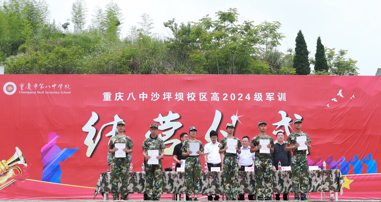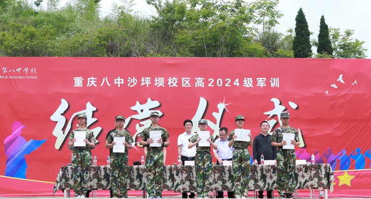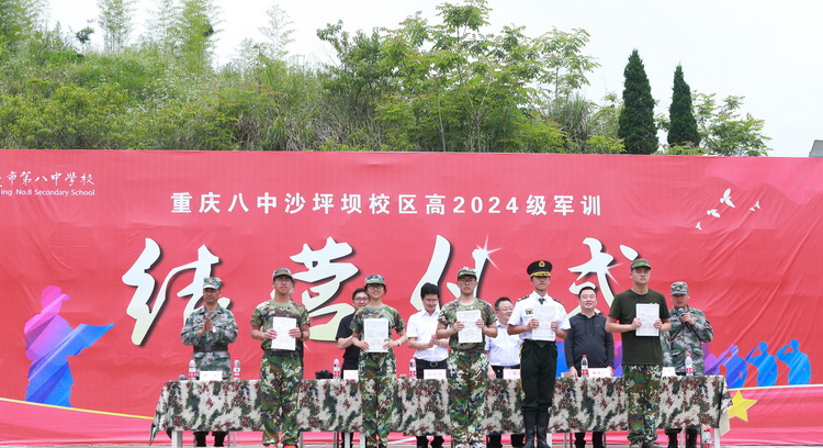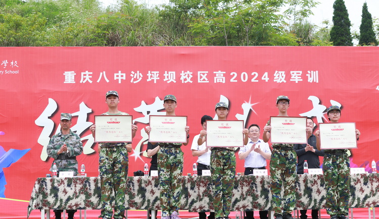 学生表演在此告一段落,随即,重庆八中学生处主任贺先进宣读了嘉奖通令,并进行了颁奖仪式,为军训期间的优秀连队与个人颁奖,激励同学们奋发向上,争得荣誉。来自二十七班的成天伟同学代表所有参训学生发言,总结了几天来训练的心得体会,并抒发自己对未来的展望。最后,重庆八中副校长梅家烨讲话,总结了六天来的军训历程,表达了对同学们这六天训练的高度肯定,激励同学们将军训中所获得的应用到实际生活中,志存高远,这令同学们受益匪浅。