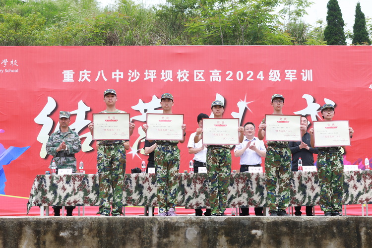 10号一早,军训结营仪式隆重举行,重庆八中副校长梅家烨老师、学生处主任贺先进老师等出席仪式。军训团团长李军中校向梅家烨副校长报告并请求阅兵检阅,在座嘉宾陪同观看各连队高喊着“刻苦训练 为校争光”的分列式,欣赏同学们带来的战术方队狙击表演、军体拳表演、《中国字 中国人》手语操表演。最后,结合军训期间集体与个人的具体表现情况,经教官推荐,年级审核,最终决定授予15班、18班、23班、26班、27班“优秀连队”荣誉称号;授予以13班吴雨霏、杨雅雯等同学为代表的共计124名同学“优秀营员”荣誉称号。副校长梅家烨老师对军训作总结发言,希望同学们将这六天军训的经历珍藏,将学到的好思想、好作风保持下去;也珍惜当下的和平幸福生活,志存高远,发愤图强!至此,高2024级军训圆满落幕!