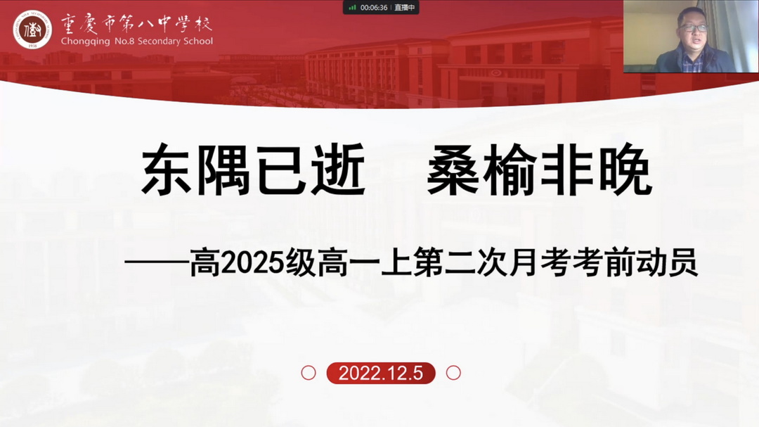 12月5日清晨7:20,高一年级陈海龙老师以“东隅已逝,桑榆非晚”为主题,对高一年级全体同学进行第二次月考考前动员。通过钉钉平台,本次朝会向全年级同学乃至家长朋友直播。