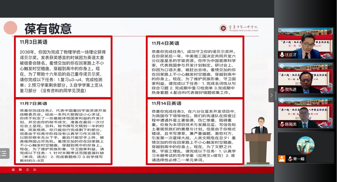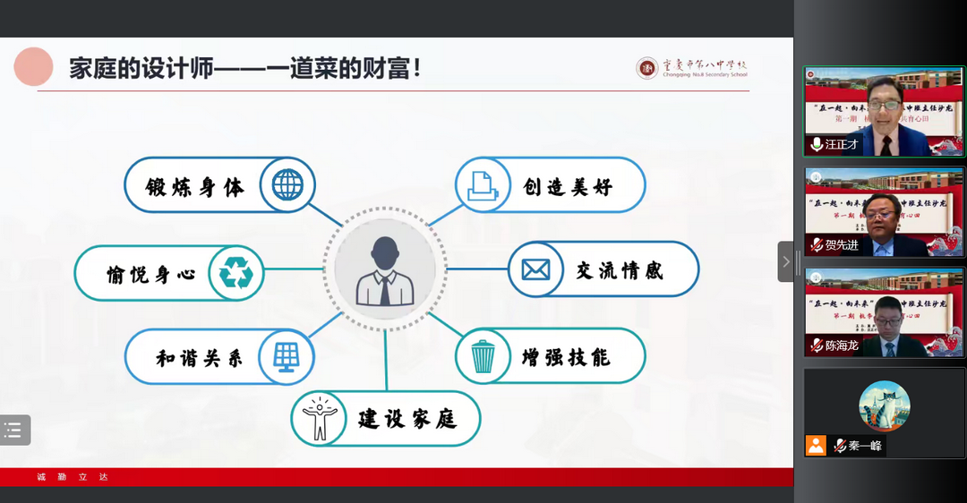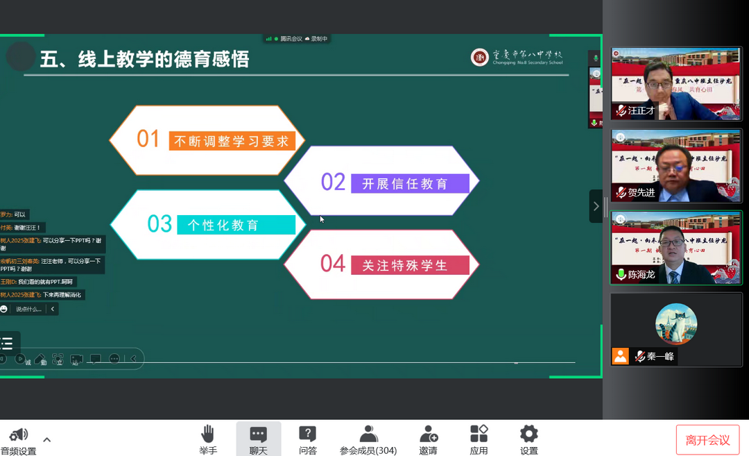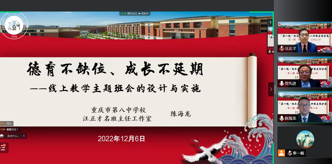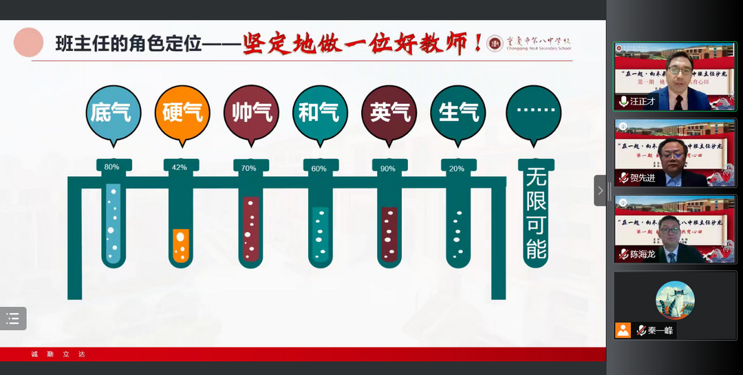 为促进班主任队伍成长,交流网课期间班级管理、班会组织等线上经验,重庆八中学生处与汪正才名班主任工作室合作组织了班主任沙龙线上交流会第一期。本次沙龙由八中学生处主任贺先进老师主持,由名班主任工作室主持人汪正才老师与工作室学员陈海龙老师进行分享,共吸引了全校300多名班主任教师与青年教师观摩。