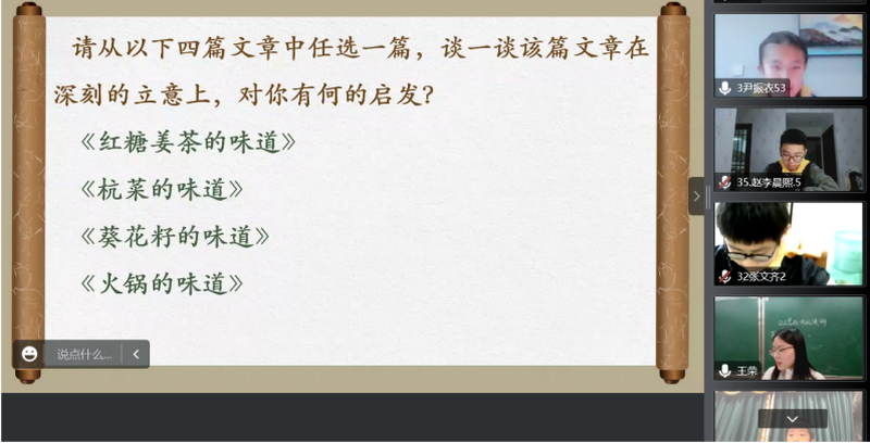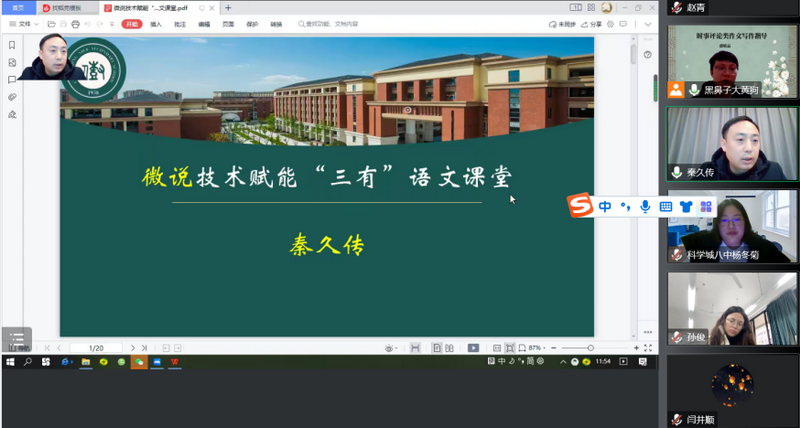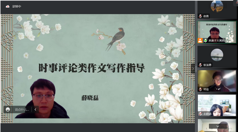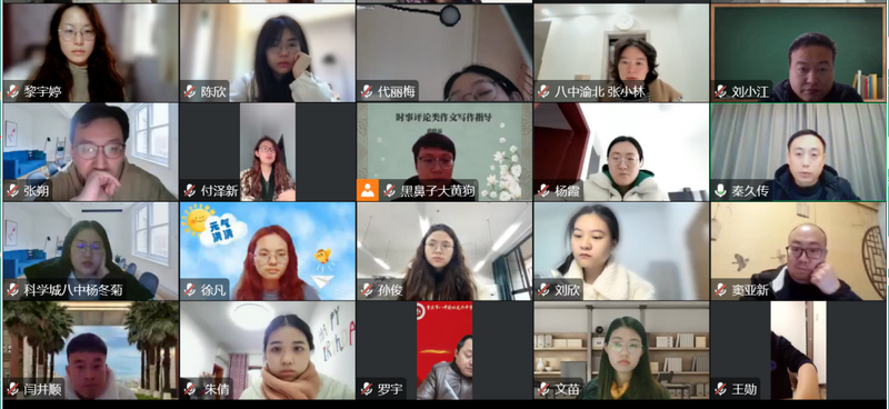 受疫情影响,线上教育成为一种新常态。在此背景下,为以研促教,优化线上教学策略,提高线上教育教学实效性,12月6日上午,重庆八中初、高中语文教研组线上联合召开“充分借助技术手段,提高写作指导实效”主题研讨会。本次活动由重庆八中高中语文教研组长秦久传主持,重庆八中副校长张泽勇、渝北校区副校长曾顺勇莅临指导,我校初、高中百余名语文教师以及八中“智慧云校”的老师们踊跃参与。本次研讨活动由线上课堂展示、授课教师说课、专家教师评课、专家教师微讲座四个环节组成。