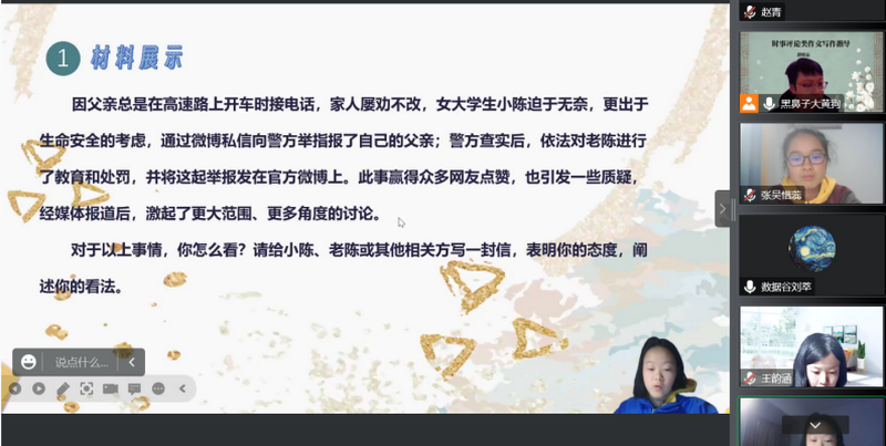 张小林老师肯定了薛老师在课前所做的详尽扎实且有序列性的工作,她认为这堂课亮点十足,是一场思维成果展示与网络技术完美结合的一堂课。学生用共享屏幕的方式呈现学习成果,是线下教学无法实现的。张老师认为,王荣老师的选题贴近学生的生活,注重层层剖析,对学生进行思维引导和碰撞,打开了思维的大门。