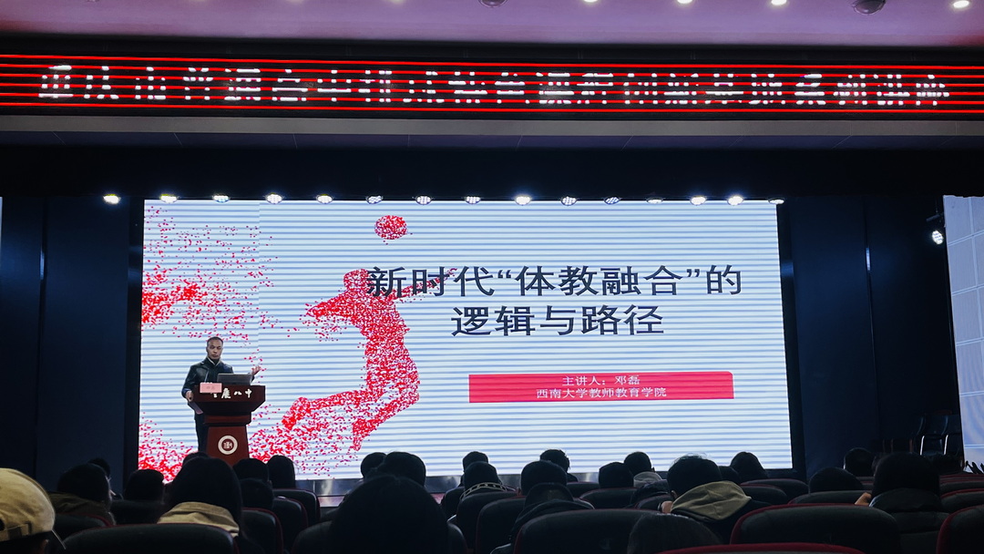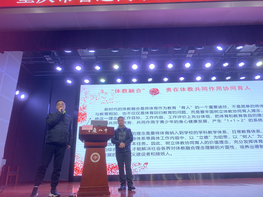 2023年2月13日,重庆市第八中教育集团校各校区体育教师相聚于重庆八中渝北校区树人堂,参加学习“新时代体教融合的逻辑与路径”专题讲座,此次讲座由西南大学教师教育学院教授,博士生导师邓磊主讲,为重庆八中集团校全体体育教师开展了一堂别开生面的培训。邓磊教授以风趣幽默的演讲风格,生动鲜活的案例为全体体育教师阐述了体教融合的背景、逻辑与路径,摸清了新时代的体育发展新风向,为重庆八中体教融合发展提供了有效的建议。邓磊教授结合国际国内形式、体育发展现状,为全体教师阐述了当前体育亟需寻求突破与发展的需求;通过对国家相关政策的解读,为体教融合屡清“体”“教”“融”三条逻辑,既:体育—体验—体悟;教养—教育—教导;融入—融合—融生;结合需求与背景,指出了认知青少年健康成长的需求、发挥学校体育主体地位、体教共同作用协同育人三条路径。