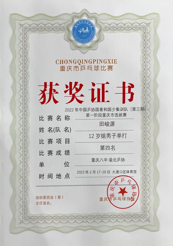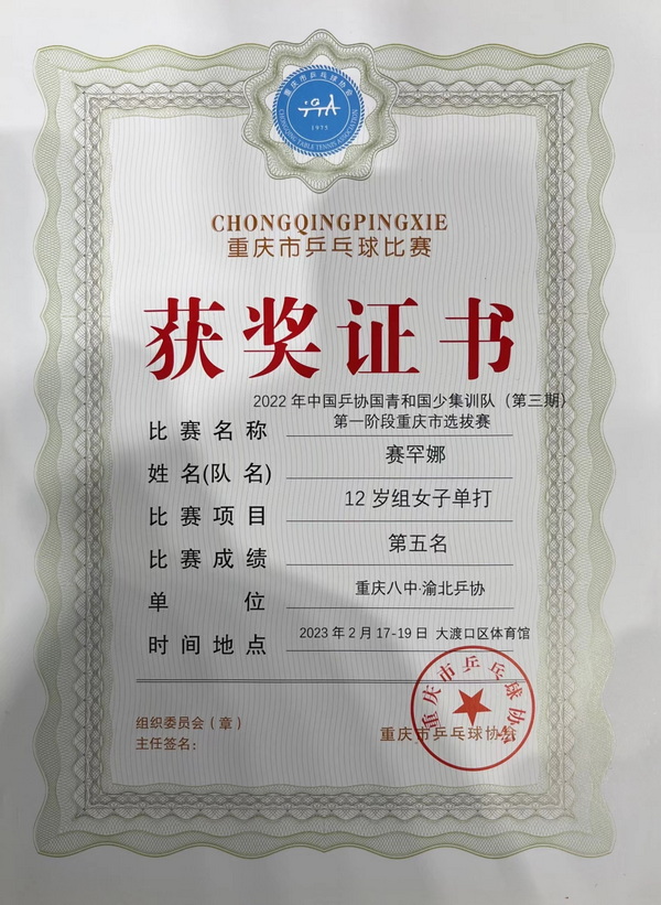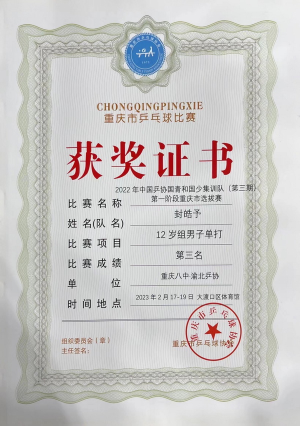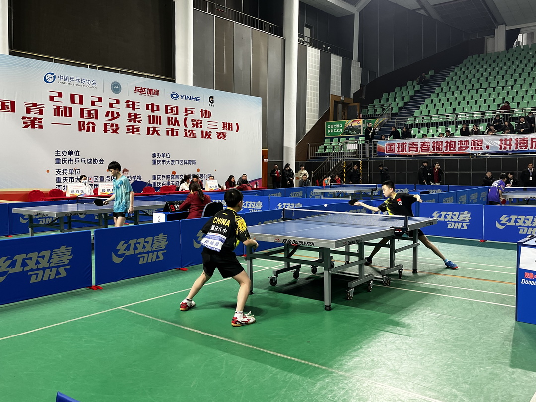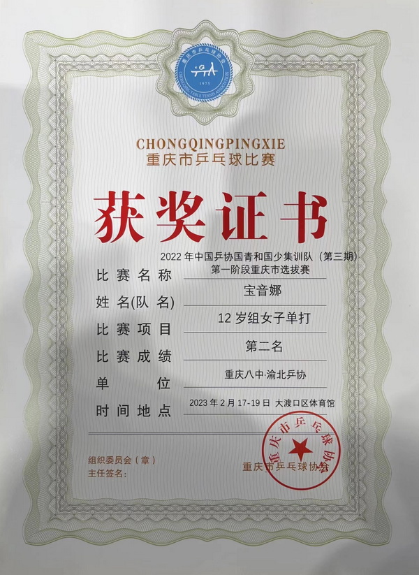 2023年2月17-19日,2022 年中国乒协国青和国少集训队(第三期) 第一阶段重庆市选拔赛在大渡口体育馆落下帷幕。该赛事是重庆青少年乒乓球赛中规模最大,水平最高的比赛,由中国乒乓球协会担任指导单位,重庆市乒乓球协会主办。本届共有近700名运动员参与8个年龄组的角逐。各组别前三名将代表重庆市参加第二阶段全国赛的选拔。重庆八中校乒乓球队共有四名运动员参加2010年组的比赛。其中宝音娜参加2010年女子组斩获单打亚军,获得参加全国赛的名额。封皓予参加2010年男子组斩获单打季军,获得参加全国赛的名额。田峻源参加2010年男子组获得单打第四名。赛罕娜参加2010年女子组获得单打第五名。八中梯队队员任小轩参加2011年组,连续两届打进国少队,根据比赛规程,无需参加重庆选拔赛,直接晋级全国赛。重庆八中培养学生全面发展,在体教融合的大背景下,构建起"1 2 3"的高水平队伍,一个具有历史传统及特色的女子排球队,两支市级传统项目田径和男足,三支体教融合共建的乒乓球队、羽毛球队、游泳队。近两年来重庆八中乒乓球队组建和发展已经进入新的阶段,在各类赛事中取得优异成绩,我们相信,重庆八中乒乓球队将会越来越好。