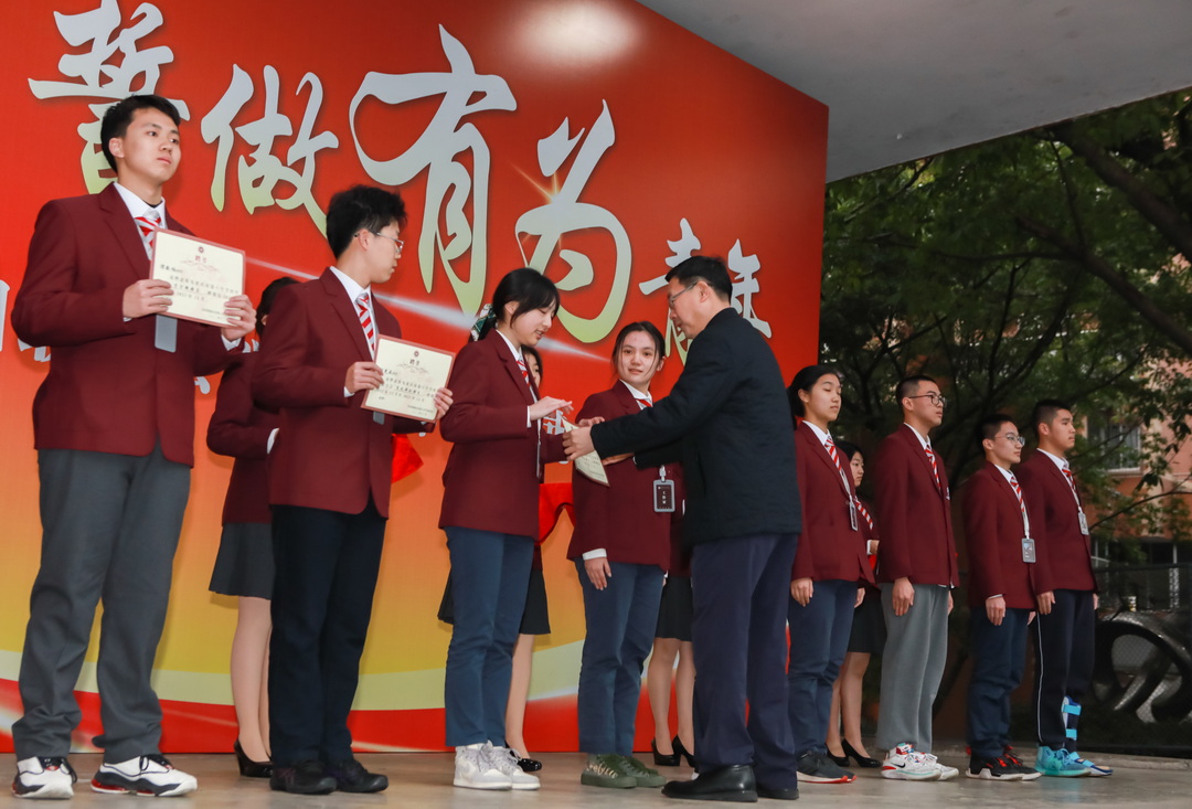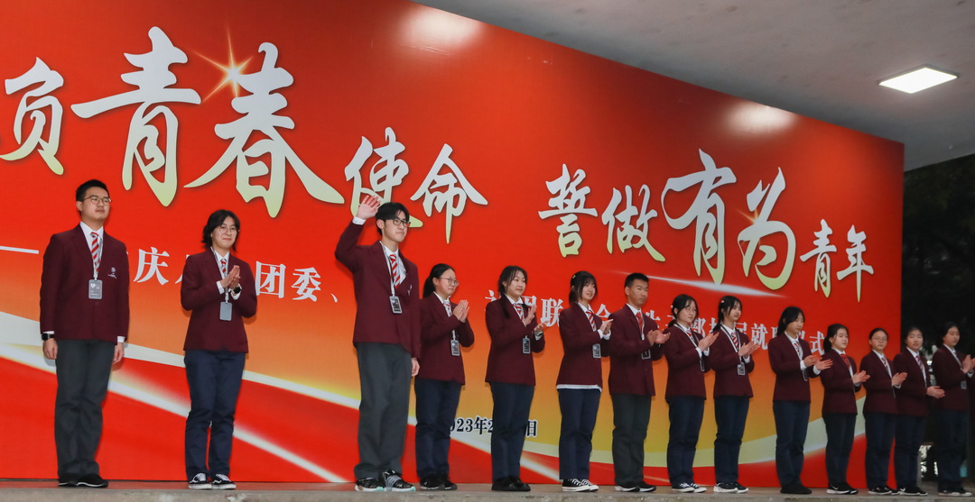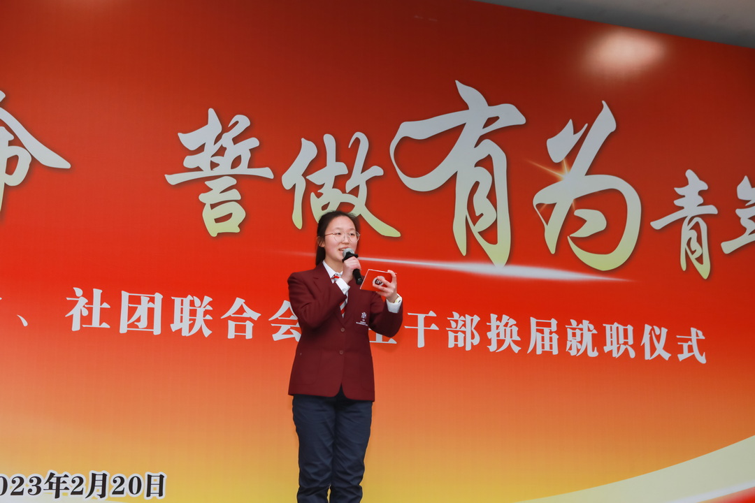 学生处副主任杜钦芝老师宣读对高二团委、学生会、社团联合会全体成员的表扬决定,由党委副书记王怒涛老师、副校长梅家烨老师等嘉宾为其依次颁发聘书。高二团委副书记覃枥乐、学生会副主席王滕菲、社团联合会主席王卓分别就这一年以来团队的组织建设、活动作为等作出总结,分享自己与团队的成长收获,期待下一届成员踔厉奋发,更上一层楼。