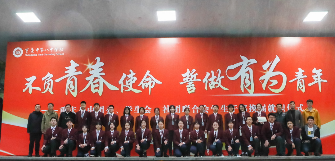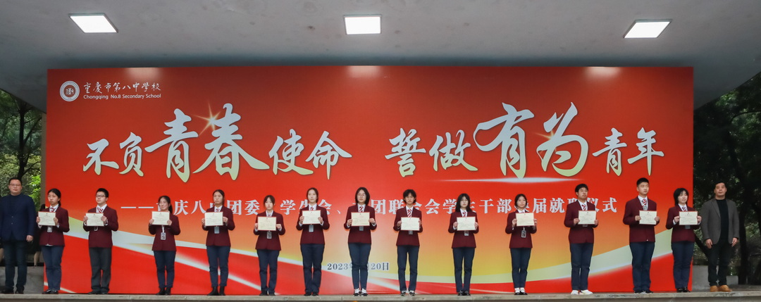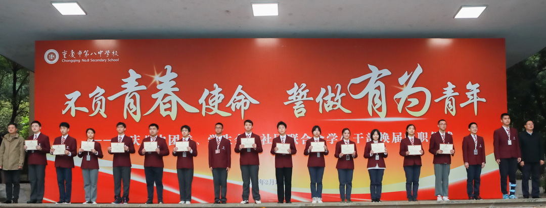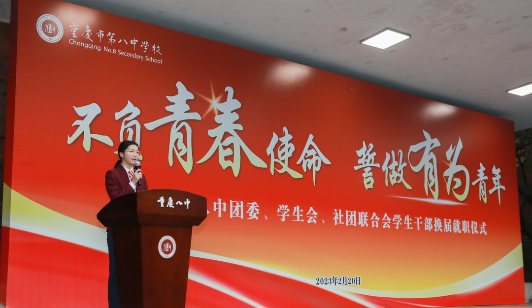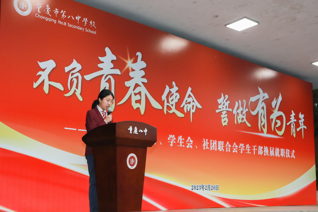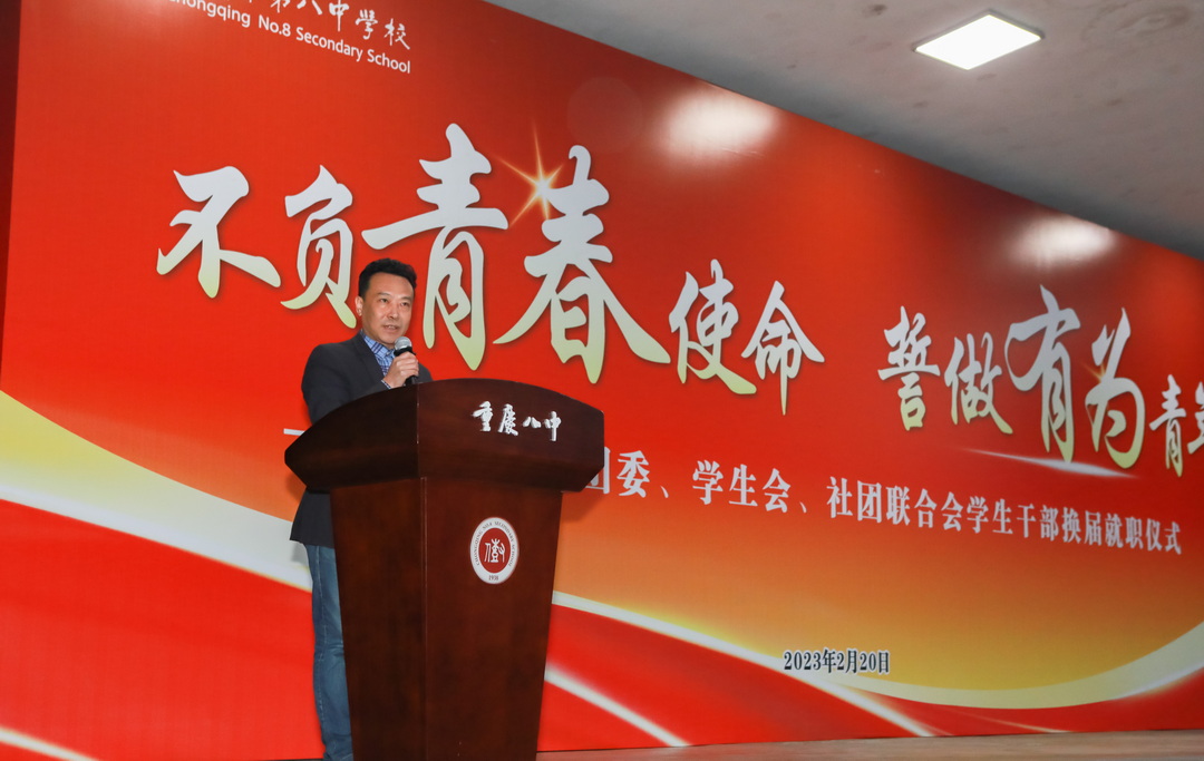 2023年2月20日下午五点十分,在高一24班张馨予同学的主持下,重庆八中沙坪坝校区团委、学生会、社团联合会学生干部换届就职仪式在操场隆重举行。高一高二年级全体学生列队参加,重庆八中党委书记卿知人老师、党委副书记王怒涛老师、副校长梅家烨老师等校领导出席活动。