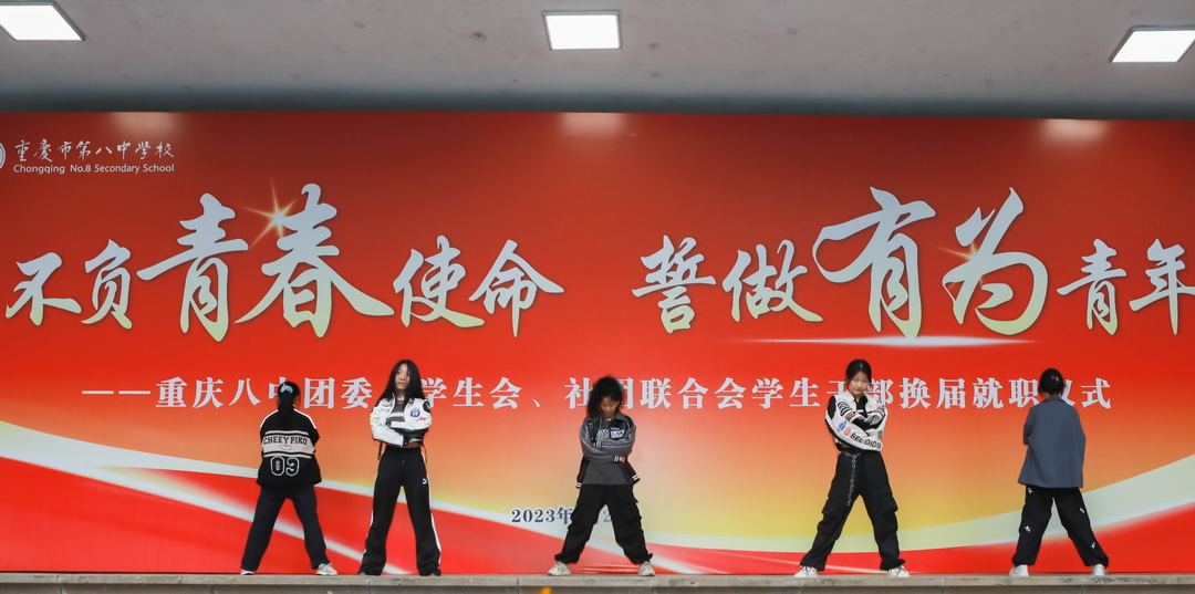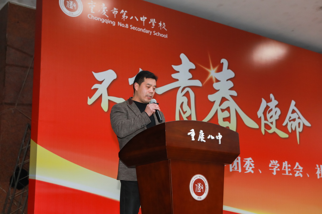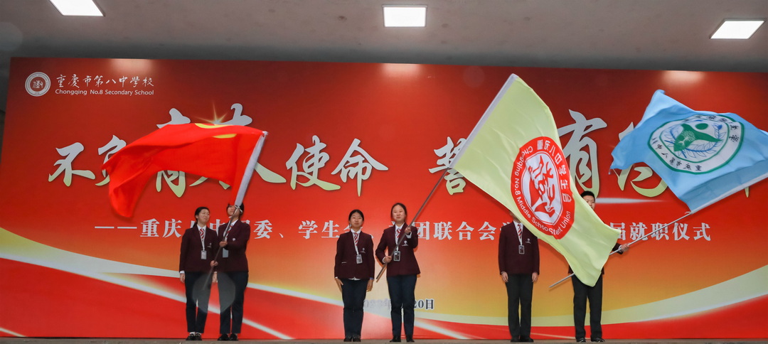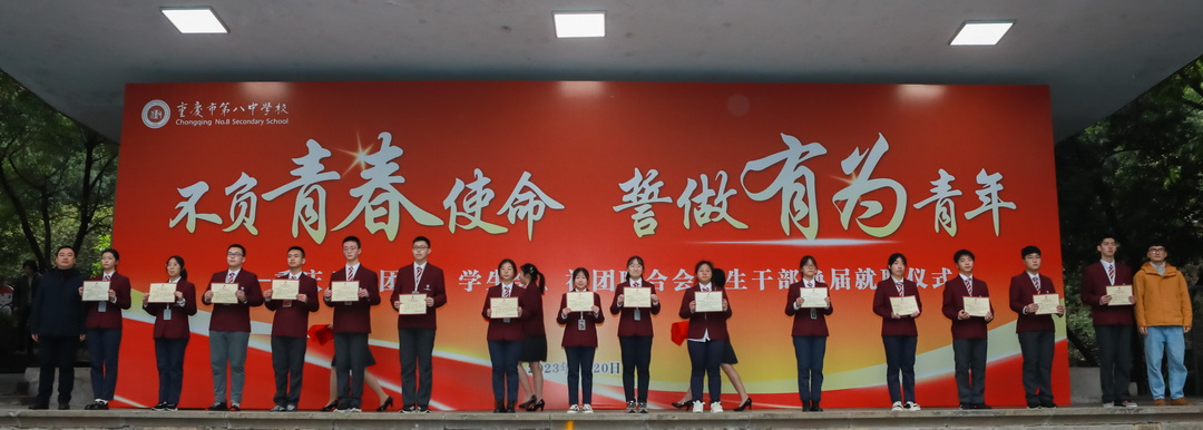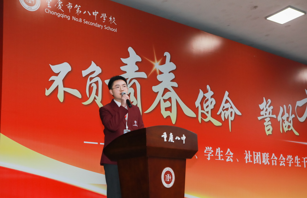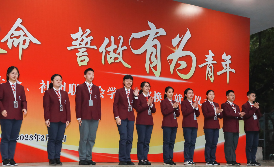 2023年2月20日下午五点十分,在高一24班张馨予同学的主持下,重庆八中沙坪坝校区团委、学生会、社团联合会学生干部换届就职仪式在操场隆重举行。高一高二年级全体学生列队参加,重庆八中党委书记卿知人老师、党委副书记王怒涛老师、副校长梅家烨老师等校领导出席活动。