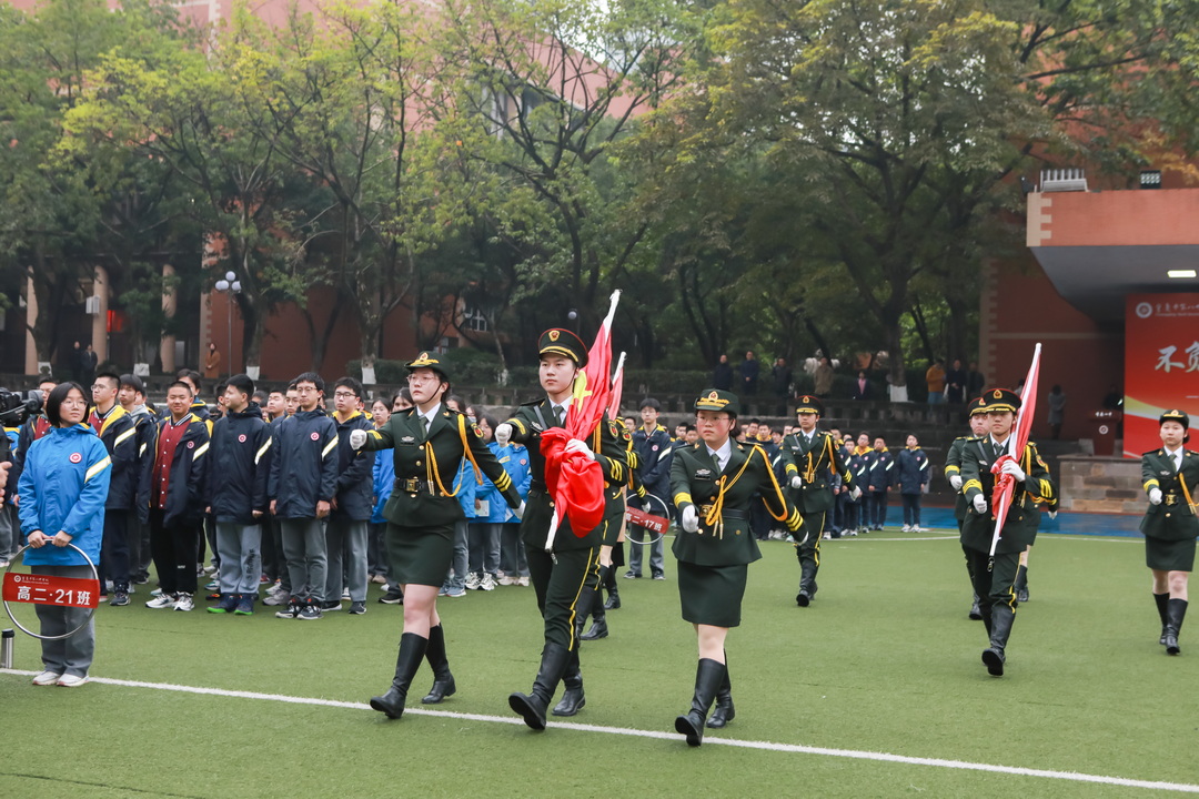 在高二年级街舞社带来舞蹈《power》暖场之后,伴随进行曲,仪仗队庄重升起国旗、校旗,学生干部换届就职仪式正式开始。