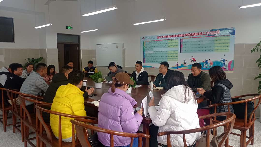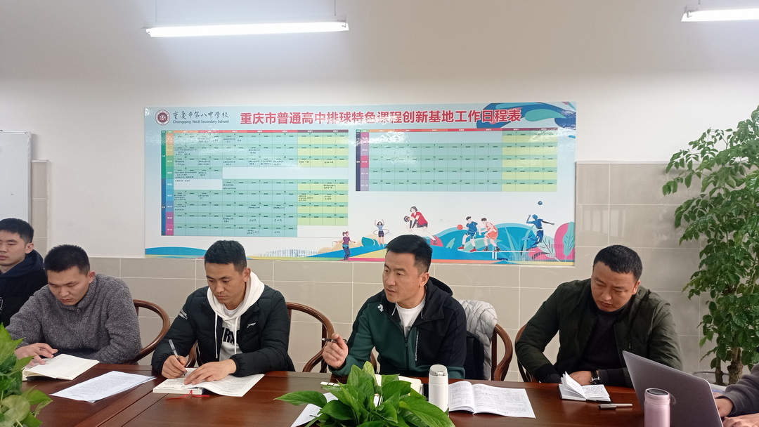 2023年2月28日,在重庆八中渝北校区排球课程基地办公室召开全国体育大会排球大课间、精品展示课研讨会,本次会议围绕大课间和精品展示课召开了两个阶段的研讨,由重庆八中高中体育教研组长吕舟主持,重庆八中体卫处主任梁柱统筹工作安排,重庆八中初中体育教研组长李荣磊进行精品课程推进工作分享。