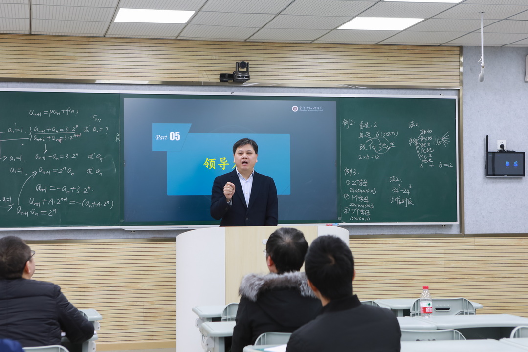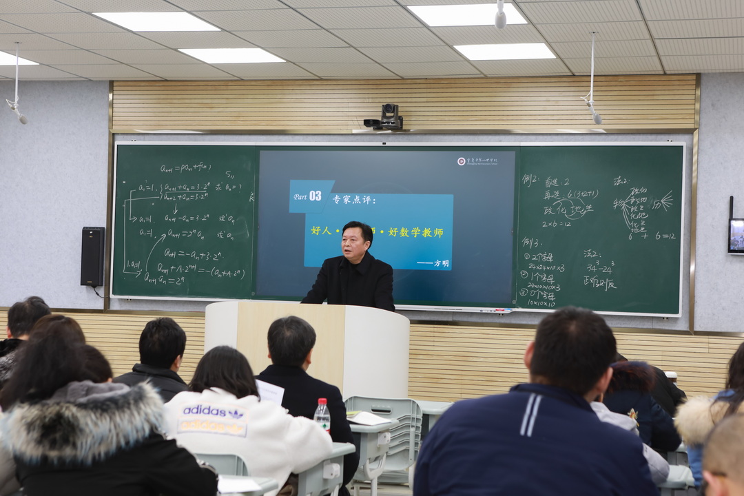 最后,副校长梅家烨和校长周迎春也对本堂课做出了点评,并和所有老师分享了他们对于教师和教学的理解。梅家烨认为,我们应该做“有独立的系统思考的老师”,要在采他人所长的同时坚持自己的东西,这样才能在最后形成自己的风格,同时提到课堂中例题的延展应该让学生有更高的思维碰撞,才能让学生有获得感。周迎春作为数学教育专家,认为数学教育最重要的就是锻炼学生的数学抽象能力和提炼能力,教师的目标是要教会学生从“解题”到“解决问题”,要让学生善于思考,主动思考,在课堂中要挖掘更高阶的有学科深度的思考抛给学生。他同时还提到了新教材的使用,作为老师,在教学过程中应该要读细教材,读透教材,理解教材的用意对于课堂教学至关重要。