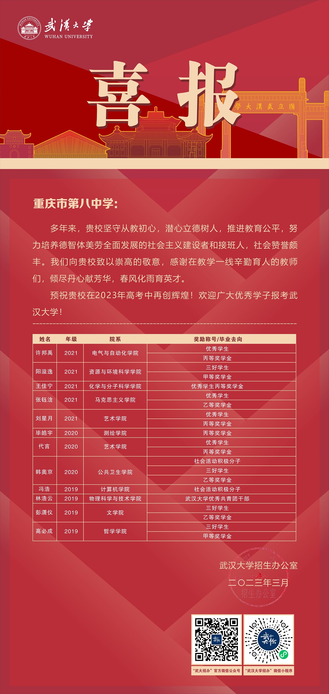 喜报:祝贺八中优秀毕业学子在武汉大学获得奖励 | 重庆市第八中学校-k8凯发集团