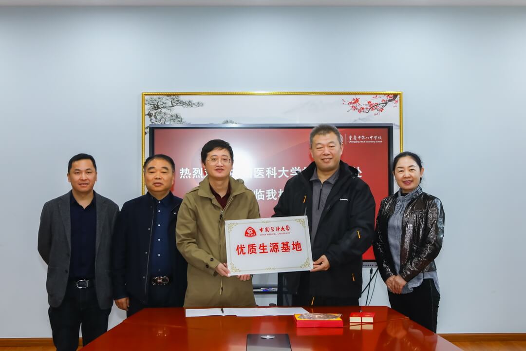 2023年3月14日上午,中国医科大学“优质生源基地”签约授牌仪式在我校树人楼第三会议室举行。中国医科大学招生就业处处长李万冬、副处级调研员潘金云、招生工作科科长郭珊珊莅临我校授牌并赠送纪念品。我校副校长梅家烨、教务处主任李明、沙坪坝校区高三年级组长范兴波参加本次签约授牌仪式。