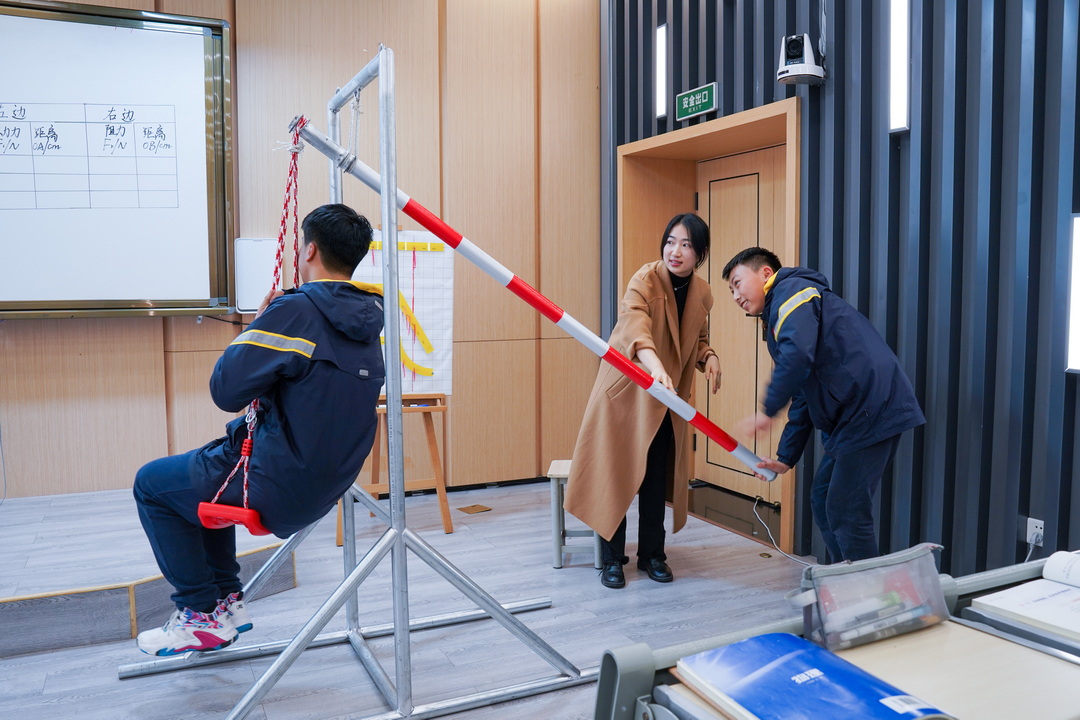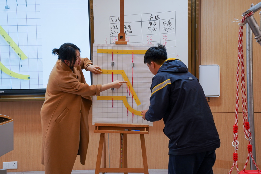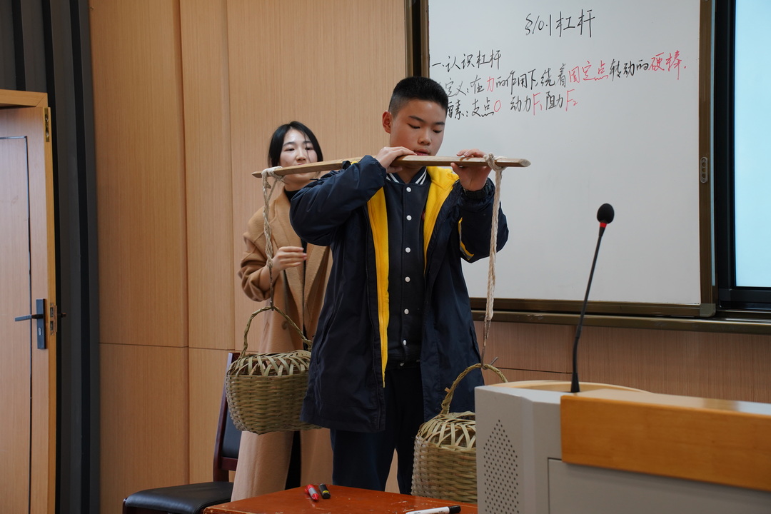 在青年教师课堂展示环节,熊尹铭老师讲授“杠杆”相关知识。熊尹铭老师首先通过“大力士”游戏引入新课,较瘦的同学能够通过杠杆抬起强壮同学的现象,激发学生的学习热情,并提出问题这涉及到什么原理。