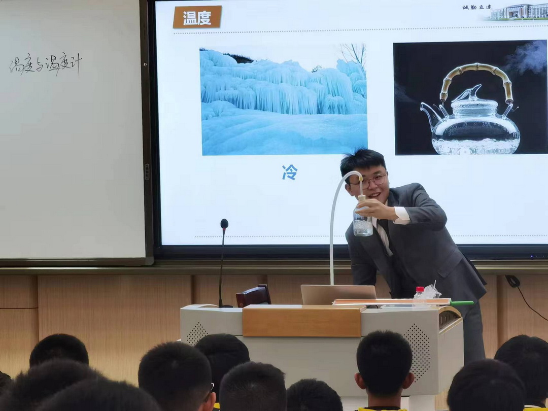 在李林老师的“温度与温度计”课堂中,首先让学生感受热的冰块儿和冷的沸水,制造认知冲突,让学生明白,仅凭个人感觉和经验,判断物体的冷热程度,是不靠谱的。从而从需求层面上,引入温度这个物理量的定义。