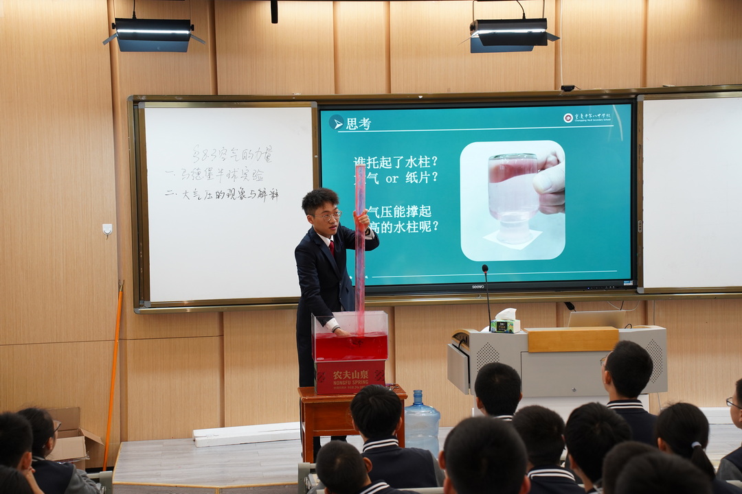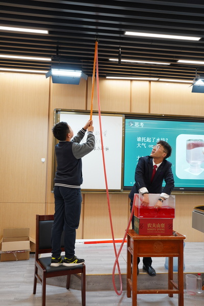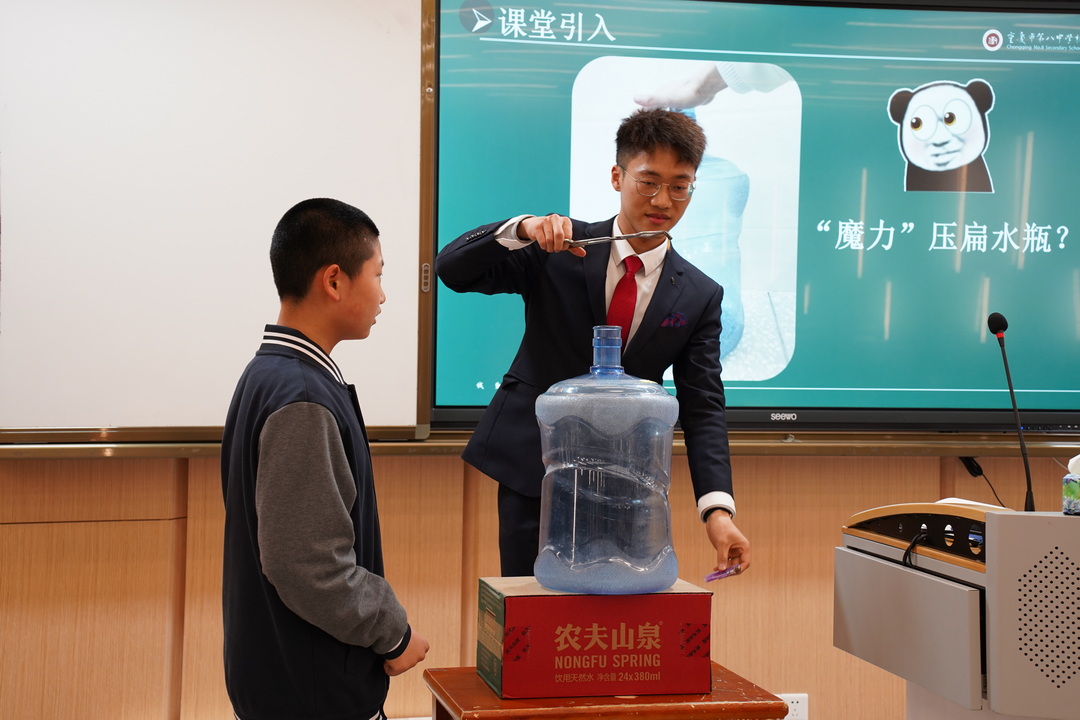 张智荣老师讲授“空气的力量”相关知识。张智荣老师的课堂首先由一个魔术展开,学生用“魔力”隔空压扁饮水机桶。随即提问,真的是“魔力”吗?经简单分析后引出“空气的力量”。