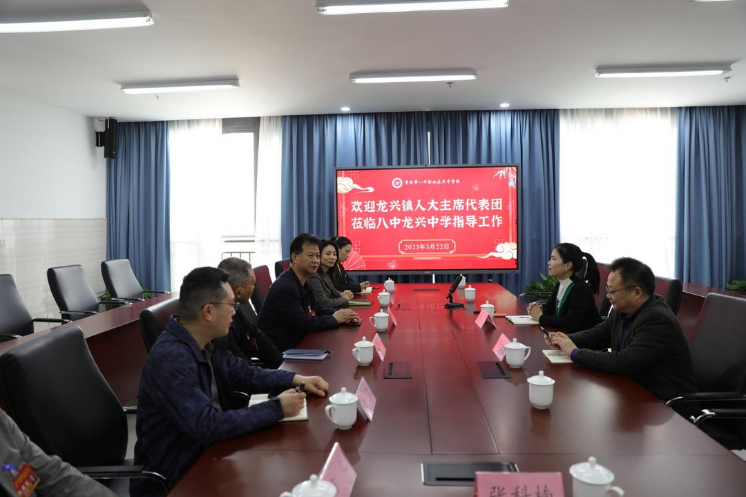 八中龙兴中学校长付英、副校长贺先进陪同参观校园并座谈。付英校长对龙兴镇人大主席团一行表达了诚挚欢迎及感谢,就学校建设、师资力量、班级文化特色等方面的情况向区镇人大代表作了详细汇报。
