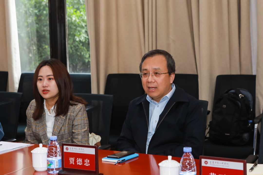 座谈会上,贾德忠校长一行对我校深厚的文化底蕴、卓越的教育教学成绩表示肯定,认为我校管理理念先进、生源质量优秀。据贾德忠校长讲解,北外为助力国家“一带一路”战略实施,搭建好中国与世界沟通的桥梁,所设语言专业种类已从十年前的50余种扩充发展到如今的101种。除传统优势学科外,贾德忠校长还从文、法、经、管多学科协调发展的专业格局、跨学科宽口径创新拔尖人才联合培养模式进行了介绍,并向我校宣讲北外招生政策和出口情况。我校参会领导、教师纷纷称赞北外立足学科优势,服务国家战略。随后,两校就人才交流进行了充分细致的探讨。卿知人书记表示重庆八中敞开怀抱欢迎英语能力过硬且有志于基础教育的北外学子能来八中任教。