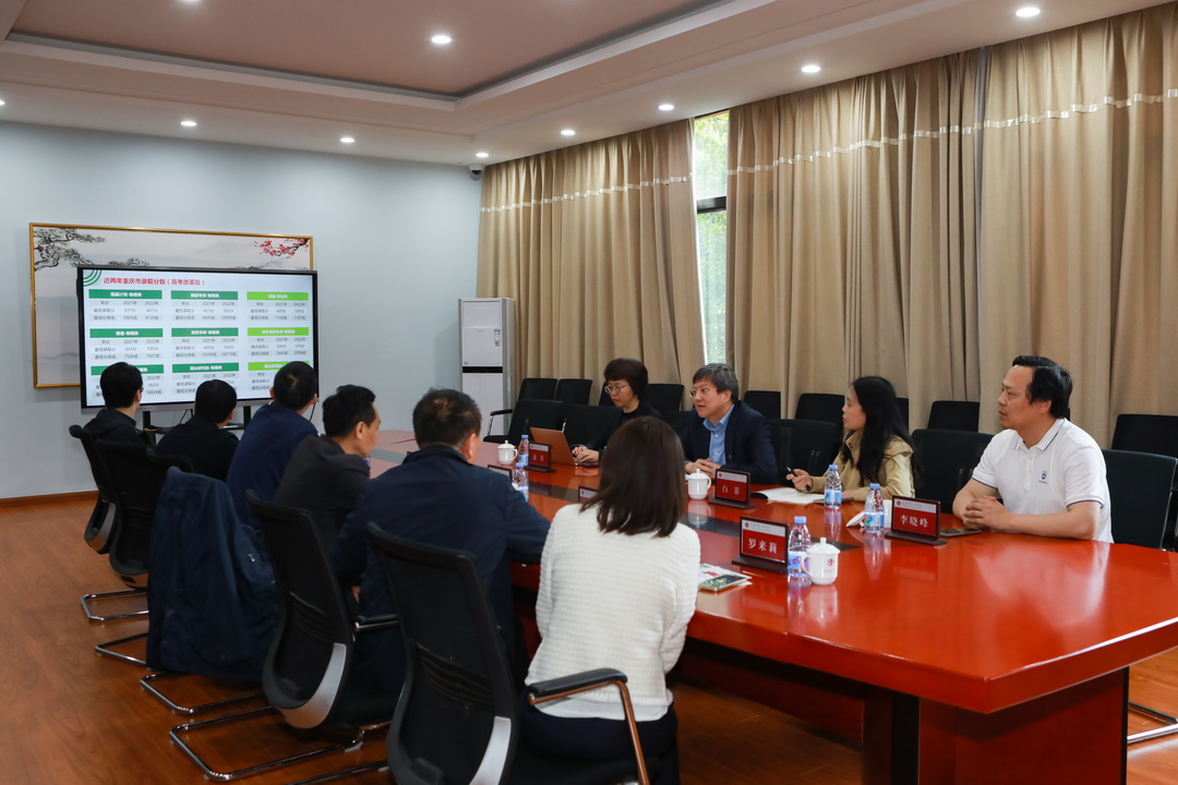 2023年4月10日上午,中国农业大学党委常委、副校长林万龙,招生办公室主任白菲,经济管理学院副教授李晓峰,动物科技学院教授俞英莅临我校交流访问。我校党委书记卿知人、副校长梅家烨、教务处主任李明、学生处副主任罗来莉、沙坪坝校区高三年级组长范兴波、年级支部书记刘钊陪同交流。