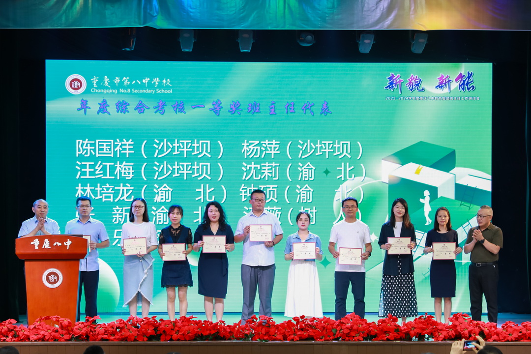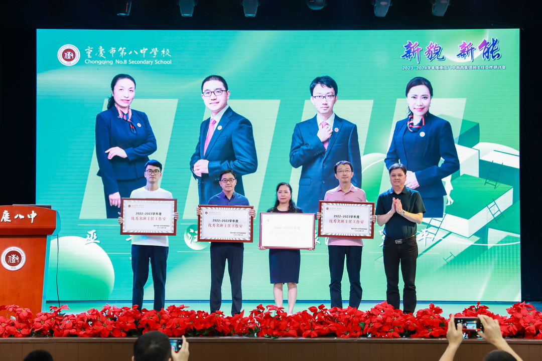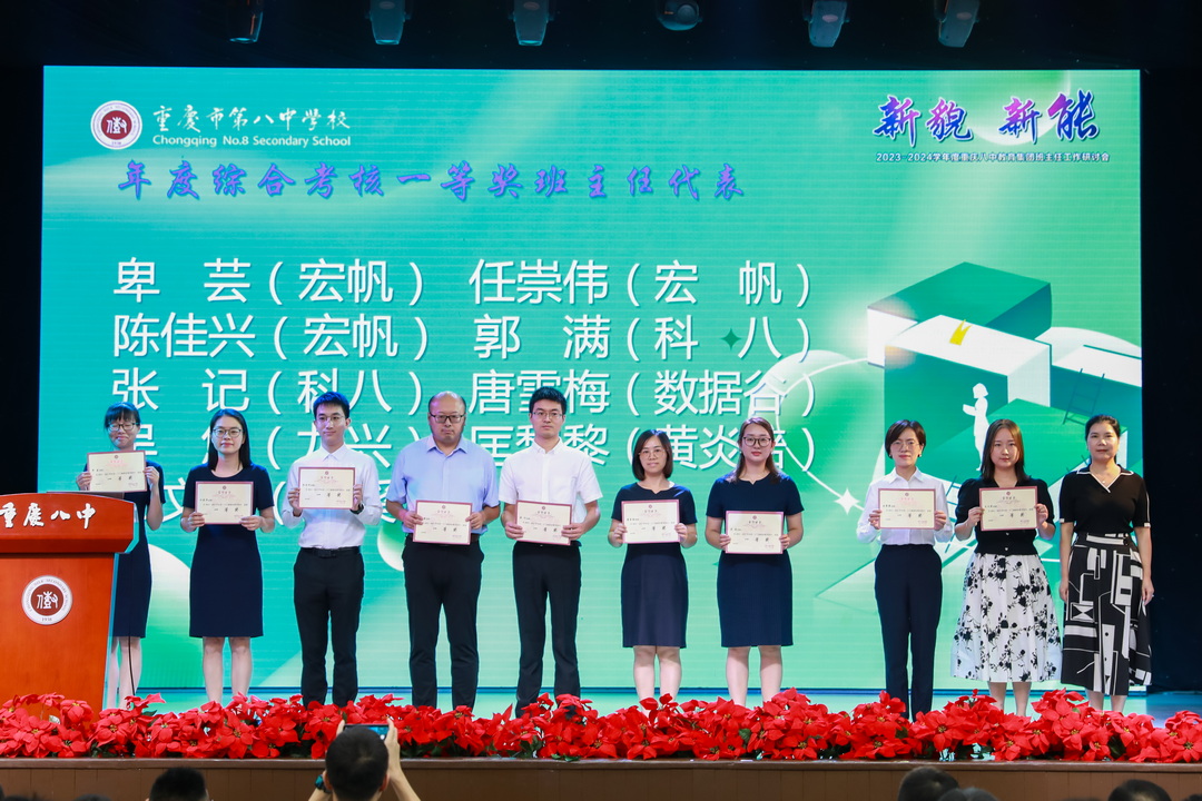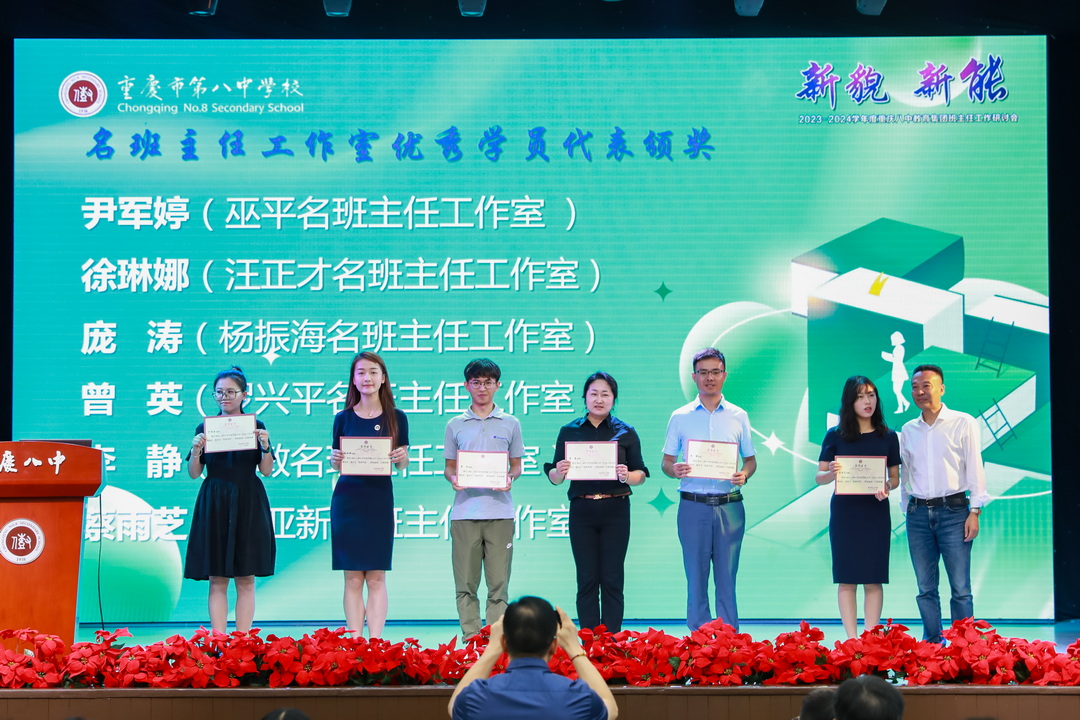 周迎春校长首先对班主任工作的开展寄予厚望,希望老师们在科技日益革新的今天能不断创新教育手段,引导学生在信息多元化的浪潮中筛选有益信息,并培养起学生的创新精神,用确定性应对不确定性。党委书记卿知人老师鼓励老师们在新时代努力成为责任的担当者、价值的引领者,充当好资源的协调者、心理的疏导者、家校的联络者、问题的解决者,共促重庆八中成为新时代教育改革的先行者。随后,学校对过去一学年度中班级管理年度综合考核结果优异的18名班主任代表颁发一等奖证书,对在名班主任工作室表现优异的6名老师授予“优秀学员”称号,对巫平老师、汪正才老师、罗兴平老师、杨振海老师领导的工作室授予“优秀名班主任工作室”称号。