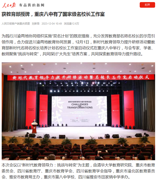 为践行川渝两地协同组织实施“双名计划”的既定措施,充分发挥教育部名师名校长的示范引领作用,合力促进川渝两地教育协同发展,12月1日,新时代教育领导力提升研修活动暨教育部新时代名师名校长培养计划名校长工作室启动仪式在重庆八中举行,与会专家、学者、教师聚焦“挑战与转变”,共同探讨“大先生”培养方案,共同探索教育领导力提升路径。