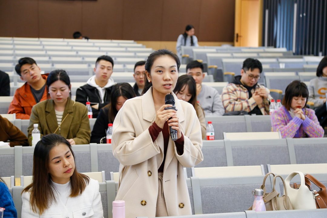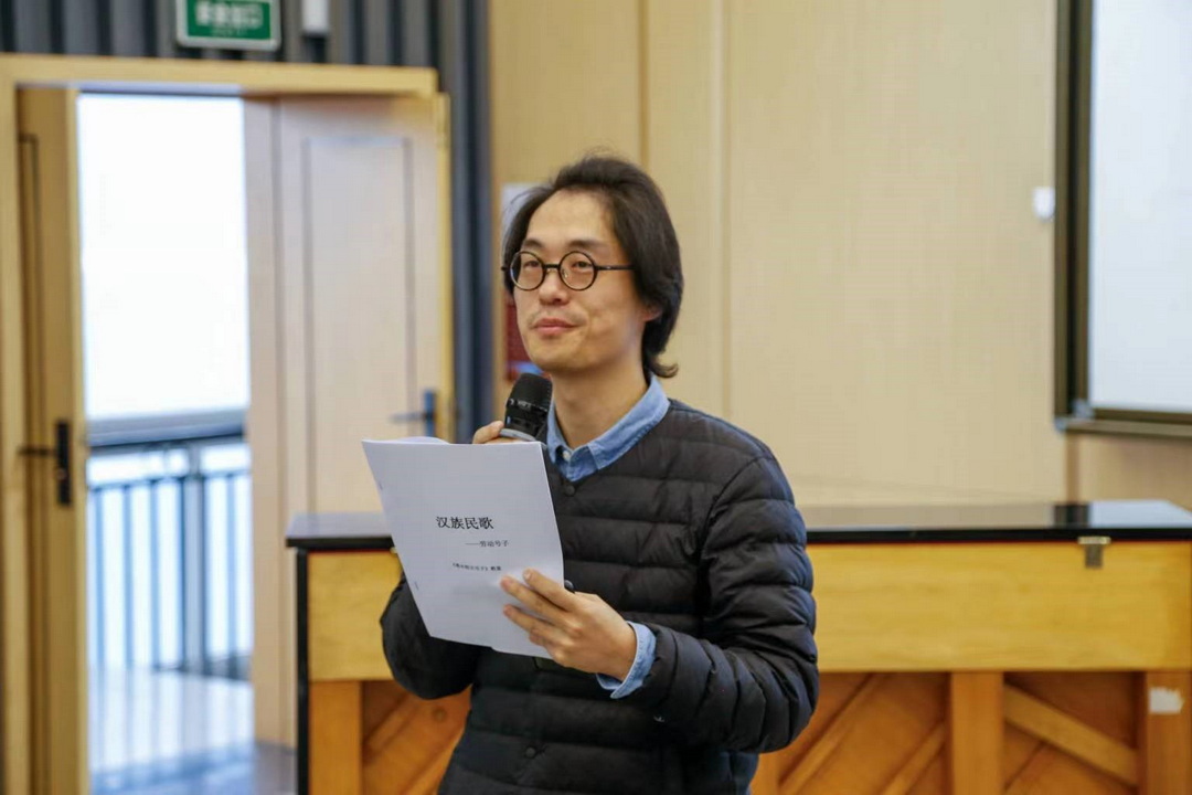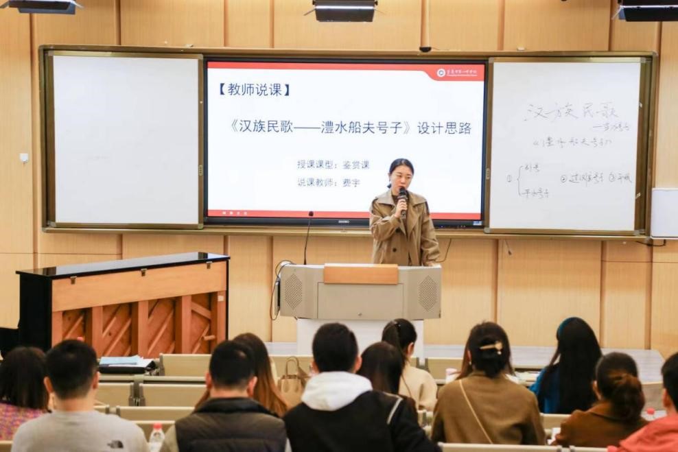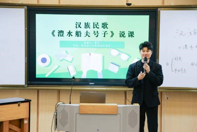本次活动在费宇老师的现场授课中拉开帷幕。费老师的赛课内容为《汉族民歌-澧水船夫子》。在导入环节,费老师动情演唱了家乡的船工号子,带领同学们立刻进入了汉族民歌的氛围,接下来费老师用讲授法和体验教学,从品号子入手,建构了由浅入深的三个环节教学。在授课过程中费宇老师还注重学生的参与,带领学生生动演绎过滩号子,将课堂气氛推向了高潮。费宇老师最后对整节课进行了总结和情感升华,引导学生要热爱我国传统的民族音乐。
