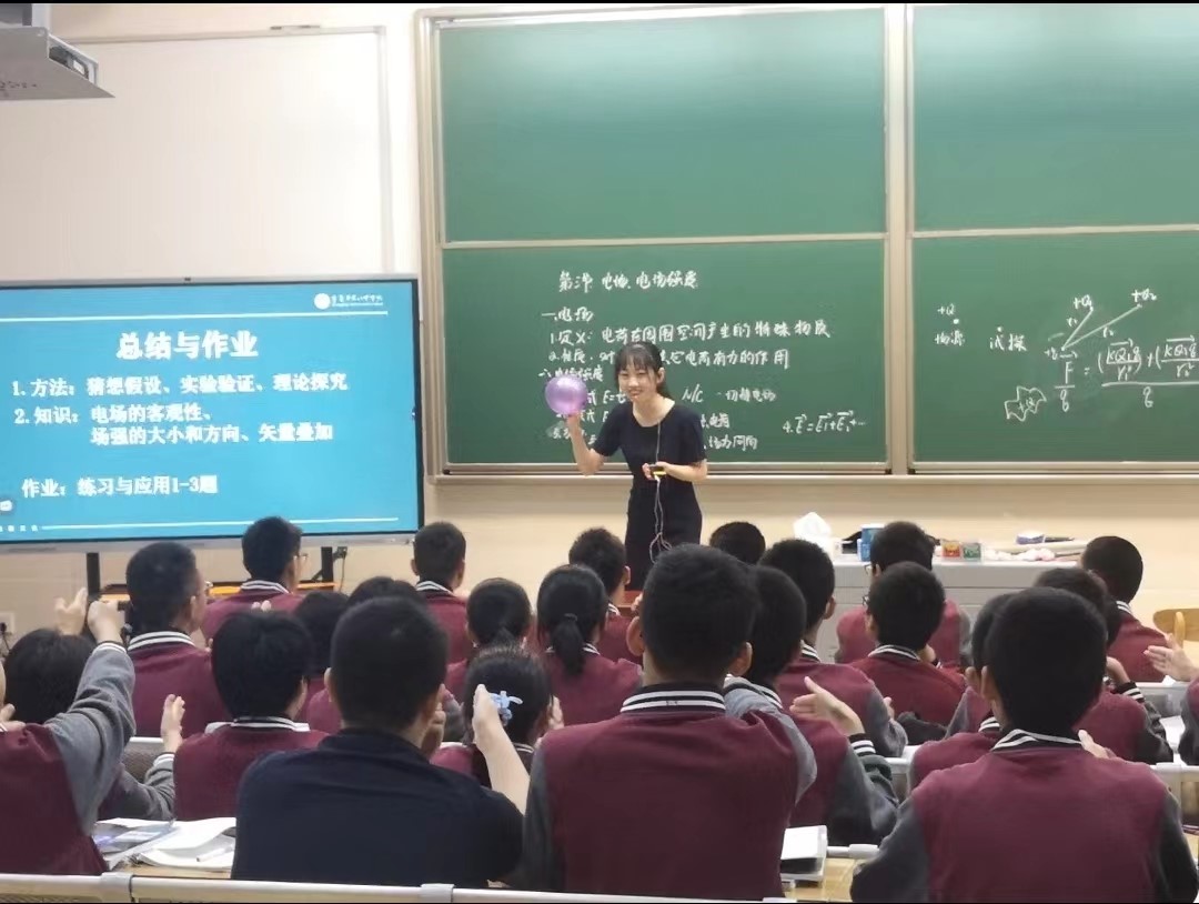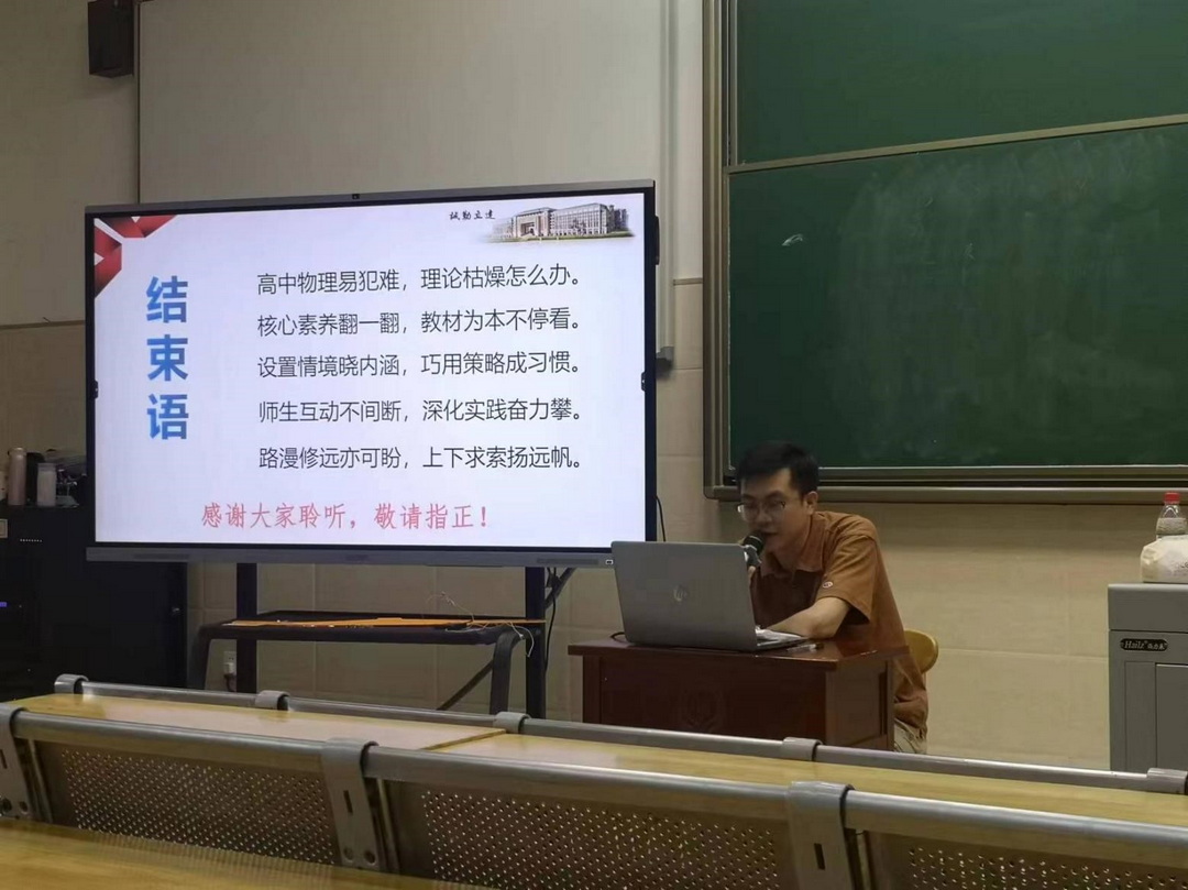在评课环节,老师们认为张宇老师问题群设计非常精妙,课堂活动非常丰富,包含演示实验、理论推导、小游戏、阅读文本等且不断进阶,创设情景,促进学习发生,关键问题的设置和课堂活动的布局高度适配。张宇老师教学语言十分简洁、洗练、善于使用短句、言简意赅,在与学生互动时能敏锐捕捉学生的信息并深入的分析,培养了学生的四种物理核心素养。