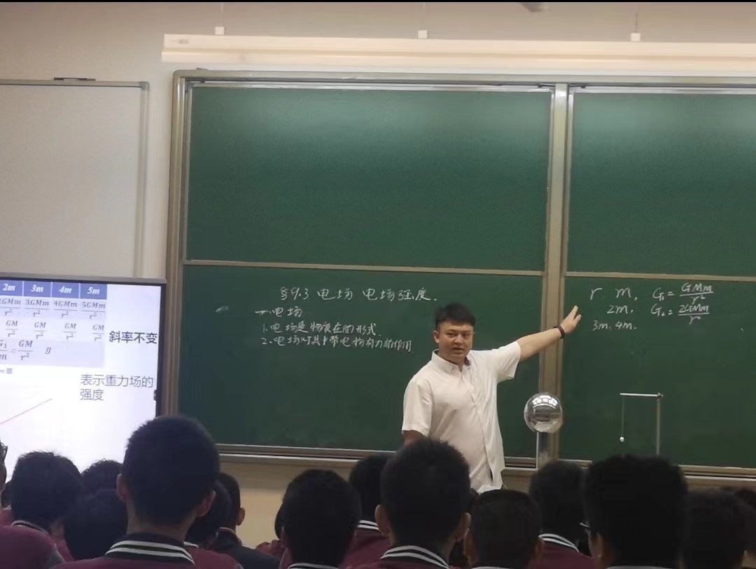 李松柏老师也以创新实验为情景,围绕范式起电机电场展开课堂。首先通过范式起电机实验说明了场的存在,引出场的概念。接下来类比以前的学习万有引力的学习情景,让重力场强度的学习过程再现,然后再将场的强度概念迁移到电场领域,引导学生推导电场强度表达式,强调电场只与场源电荷有关而与试探电荷无关。