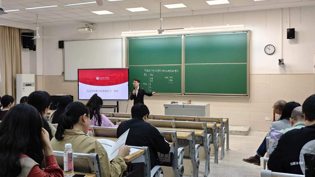 随后,刘钊老师以《历史学科教学的情景化和一体化》为主题进行了分享。他认为,高中历史教学情景化,有利于立德树人,服务选才,弥补学生基本常识和历史认知的缺憾。情景化教学的手段,可以采用角色扮演、多媒体手段、高考真题和文字材料等多种形式。情景化教学的挑战主要是场景的真实化、生活化、以及于感情上的共情和理解。