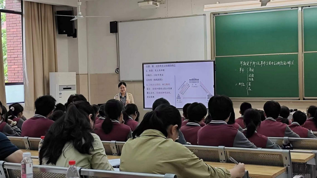 来自重庆八中的刘钊老师以及曲靖一中的余学梅老师,以《中外历史纲要(下)》的第9课《资产阶级革命与资本主义制度的确立》为题,展开了同课异构活动。刘钊老师以“比较史学”、“跨界史学”、“信息史学”为切入点,通过模拟国联活动,对教材内容进行重新整合。曲靖一中余学梅老师,结合大量的图表资料以及文字史料,对英、法、美三国的资产阶级革命进行比较分析。