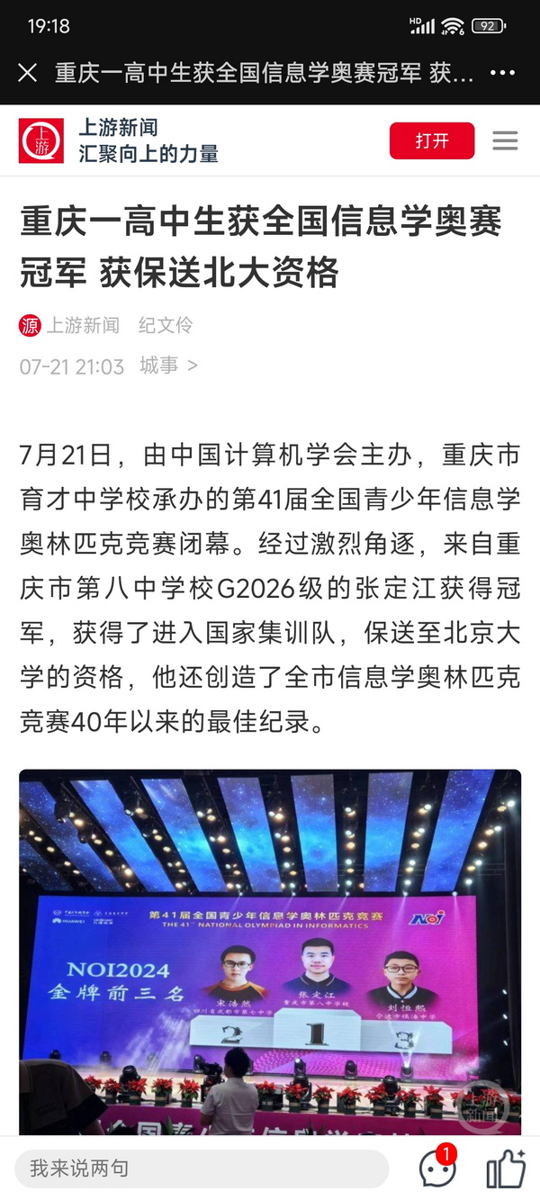 7月21日,由中国计算机学会主办,重庆市育才中学校承办的第41届全国青少年信息学奥林匹克竞赛闭幕。经过激烈角逐,来自重庆市第八中学校g2026级的张定江获得冠军,获得了进入国家集训队,保送至北京大学的资格,他还创造了全市信息学奥林匹克竞赛40年以来的最佳纪录。
