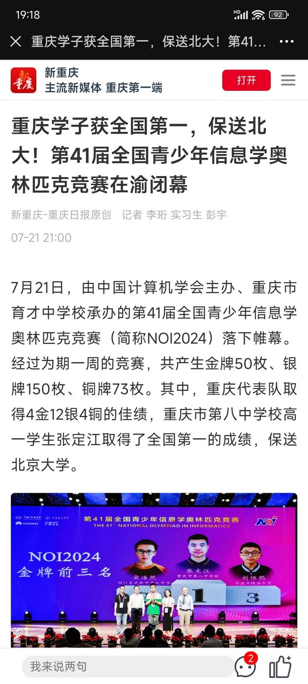 7月21日,由中国计算机学会主办、重庆市育才中学校承办的第41届全国青少年信息学奥林匹克竞赛(简称noi2024)落下帷幕。经过为期一周的竞赛,共产生金牌50枚、银牌150枚、铜牌73枚。其中,重庆代表队取得4金12银4铜的佳绩,重庆市第八中学校高一学生张定江取得了全国第一的成绩,保送北京大学。
