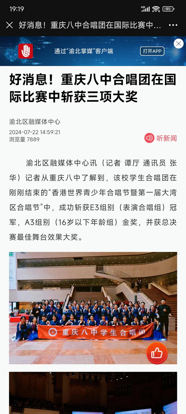 渝北区融媒体中心讯(记者 谭厅 通讯员 张华)记者从重庆八中了解到,该校学生合唱团在刚刚结束的“香港世界青少年合唱节暨第一届大湾区合唱节”中,成功斩获e3组别(表演合唱组)冠军,a3组别(16岁以下年龄组)金奖,并获总决赛最佳舞台效果大奖。