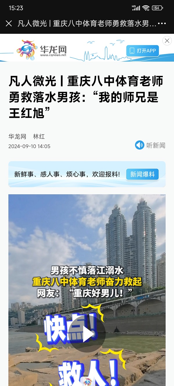 面对网友们的夸奖,刘静军直言只是“举手之劳”。类似的事情,他的一位师兄早就做过,那就是被大家所熟知的救人英雄王红旭。他们都曾是重庆师范大学体育与健康科学学院的学生,刘静军认为他的行动是对师兄王红旭见义勇为精神的一份接力。