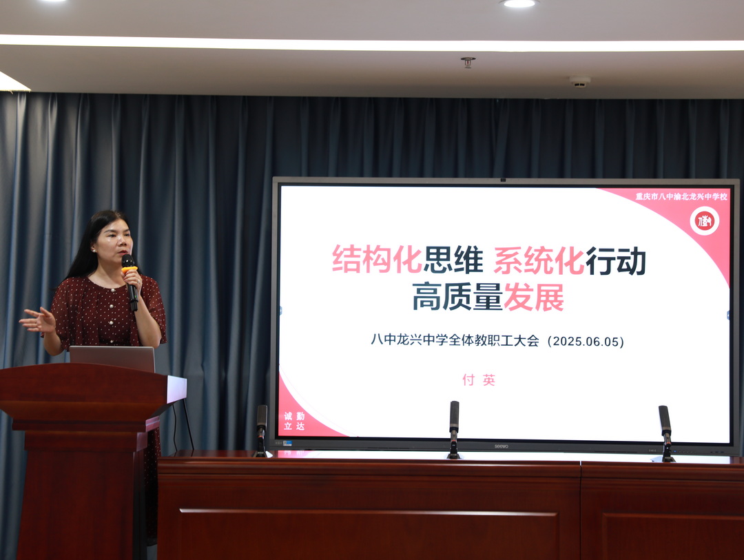 夏日蝉鸣始,教育耕耘时。2025年6月5日,八中龙兴中学于综合楼6楼会议室召开主题为“结构化思维 系统化行动 高质量发展”的全校教职工大会。校长付英、副校长贺先进出席会议,全体教职员工参会。