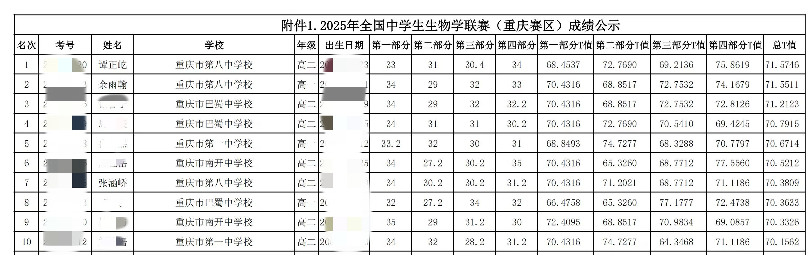2025年6月13日,2025年全国中学生生物学联赛(重庆赛区)成绩公布!重庆八中学子谭正屹以卓越表现摘得重庆市第一名,余雨翰斩获第二名!两人荣获高一年级组、高二年级组全市最高分!谭正屹、余雨翰、张涵峤、赵若杰、刘睿宇、王思钦、胡苏寒7位同学成功入选重庆市代表队!