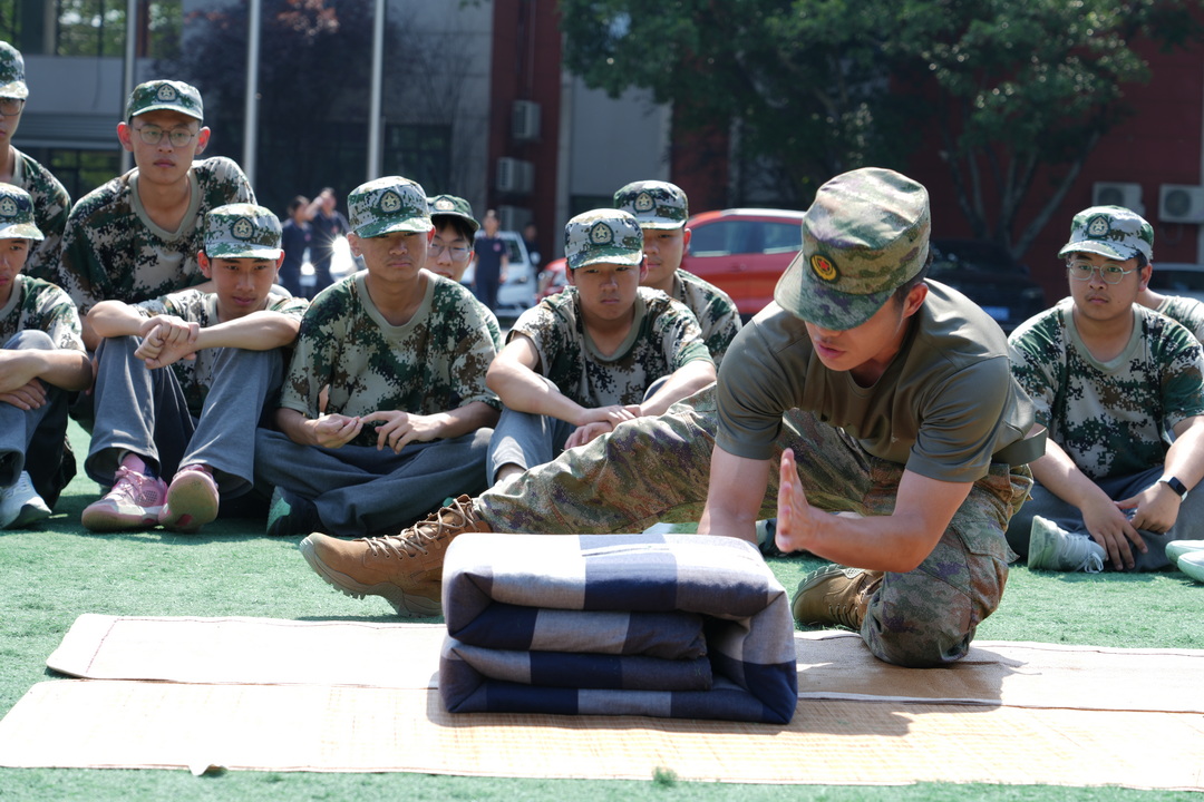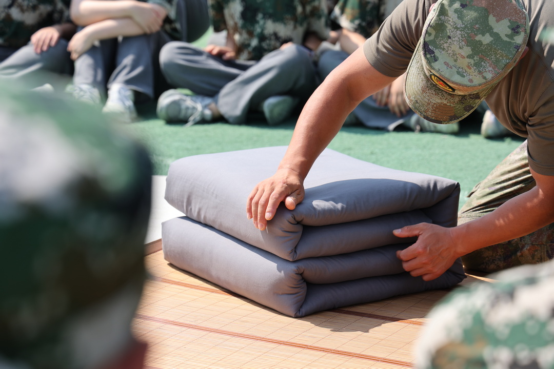 队列训练的余音仍在回荡,以操场为讲堂,化棉被为教具,另一场关于“秩序”的公开课正在上演。“三分叠,七分修!”洪亮的口令响彻操场。教官们单膝跪地,动作利落如刀,软塌的被子顷刻间化作棱角分明的“豆腐块”。每一次翻折的力度,每一次捏角的精度,都成为直观的纪律教科书。八科学子屏息凝视,方寸之地的极致规范,在开阔的操场上被放大、被铭记。