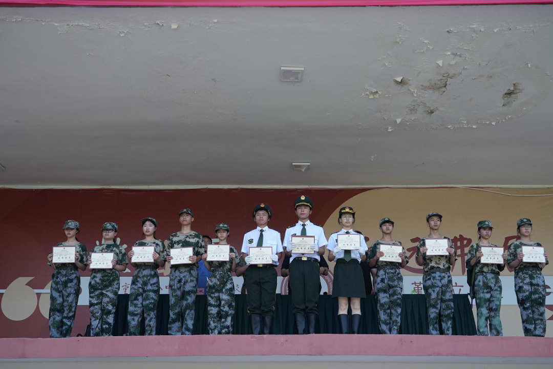 汇报表演结束后,随即对在军训中表现突出的集体和个人进行了表彰,1连,2连等10个连队被评为“优秀连队”,何林蔓、彭阳等数十名学员被评为“优秀学员”。校领导为获奖代表颁奖,学生代表1连的何林蔓同学在发言中分享了军训的收获与感悟,表达了对教官和老师的感激之情。
