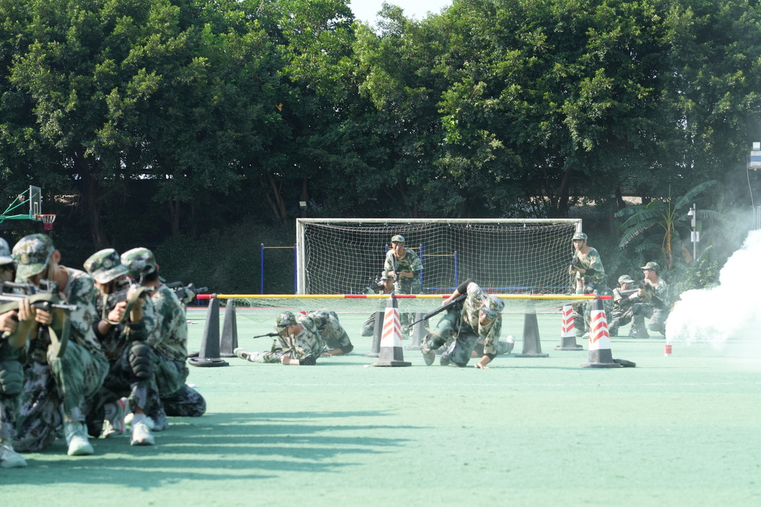 战术方阵:战术表演敏捷逼真,低姿匍匐、战术手语、协同突击……八科学子们动作迅速、配合默契,模拟实战场景中灵活应对、攻防有序。战场气息点燃热血,实战风采引爆全场喝彩。