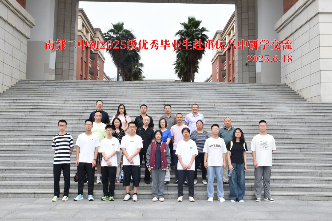 2025年6月18日,四川省南充市南部县第二中学初2025级部分优秀毕业生赴重庆八中渝北校区研学交流。南部二中双师班分管校长唐兴、高2025届年级主任秦继强、重庆八中智慧云校教学主任栗敏、教学部部长张海升、重庆八中优秀学子、南部二中初2025级优秀毕业生及家长共计约25人参与本次活动。