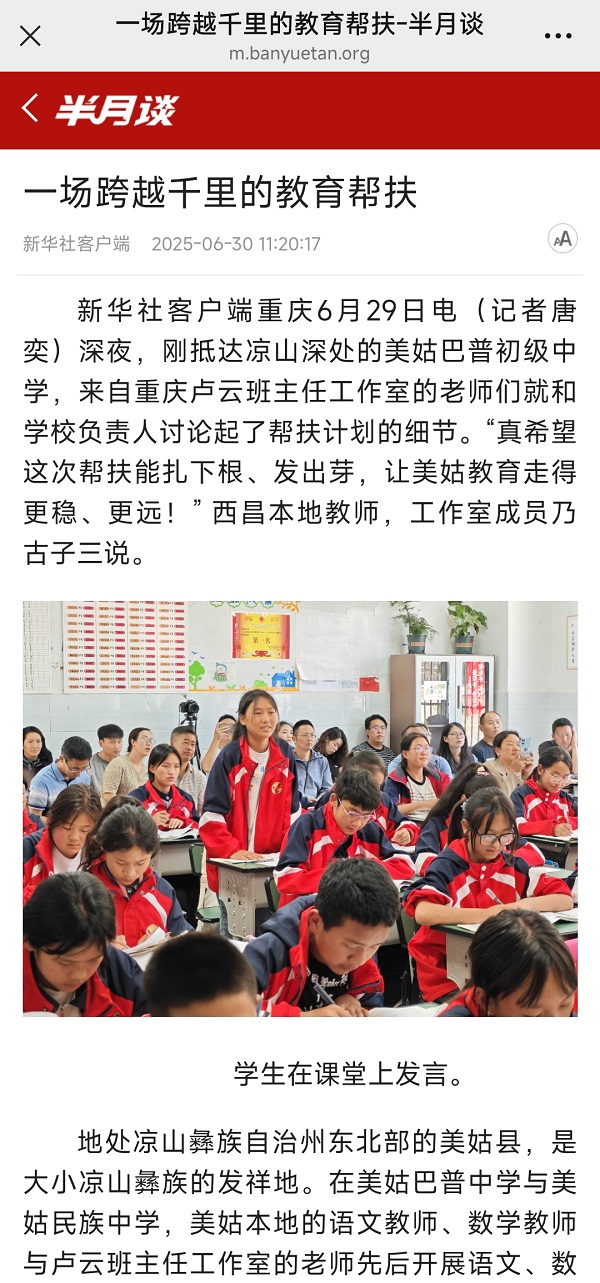 帮扶期间,美姑民族中学与巴普中学两所学校各有一位老师正式加入卢云班主任工作室。卢云班主任工作室与美姑民族中学、美姑巴普中学各六位老师进行结对,建立一对一常态化教育帮扶机制。此外,卢云班主任工作室还向美姑教育事业捐赠五万元教师成长基金,重庆八中云校向美姑两所学校分别捐赠100套工具本。