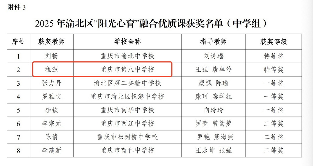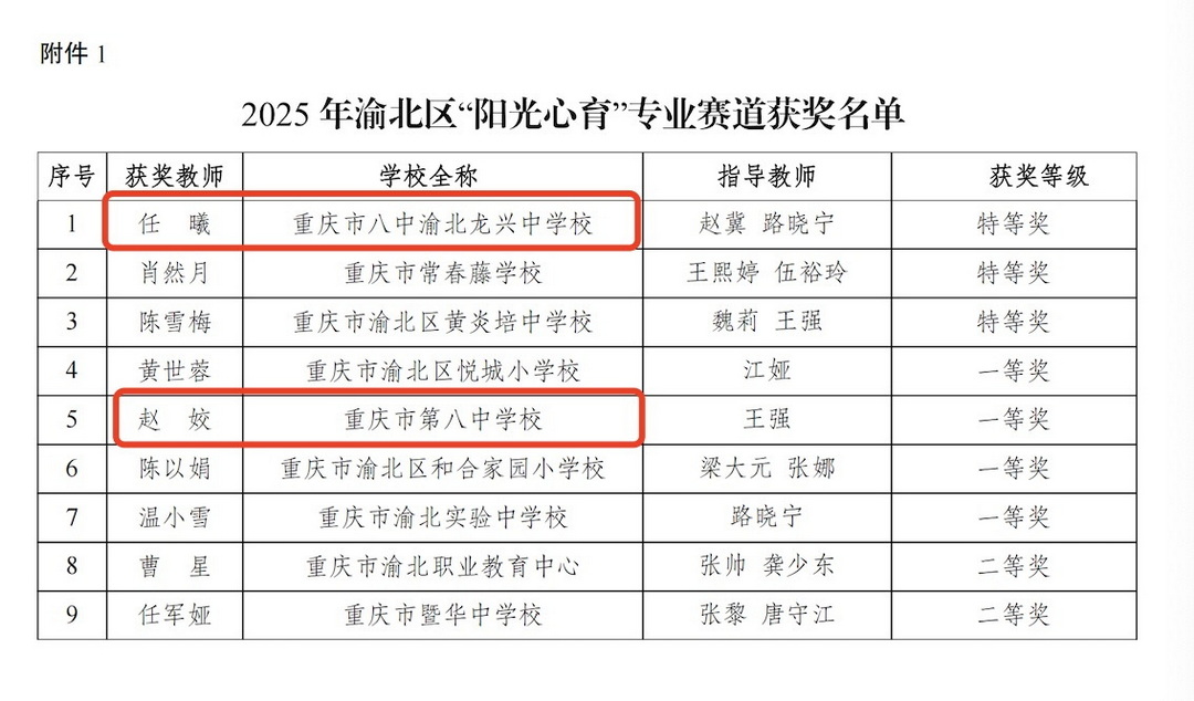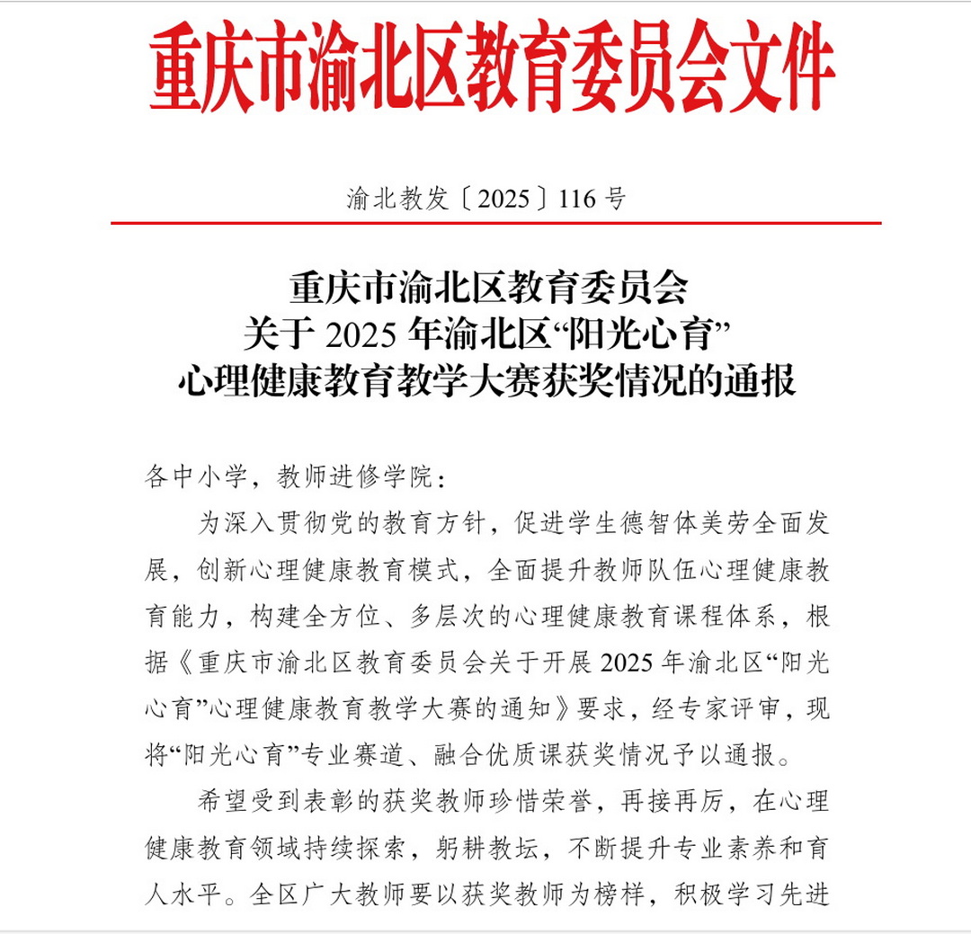 2025年6月19日,重庆市渝北区教育委员会发布了关于2025年“阳光心育”心理健康教育教学大赛的通报。我校心理教师赵姣、语文教师程源及集团校心理教师任曦在本次比赛中成绩突出,三位参赛教师均获殊荣,充分展示了学校在心理健康教育领域的探索实践与融合创新成果。
